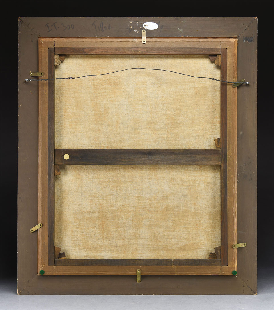 Oil on canvas depicts a girl posed next to a table with fruit and a flower filled urn. Signed lower left “FGStolberg pnts”. Housed in a gilt gold molded frame with gesso flowers and scrollwork.