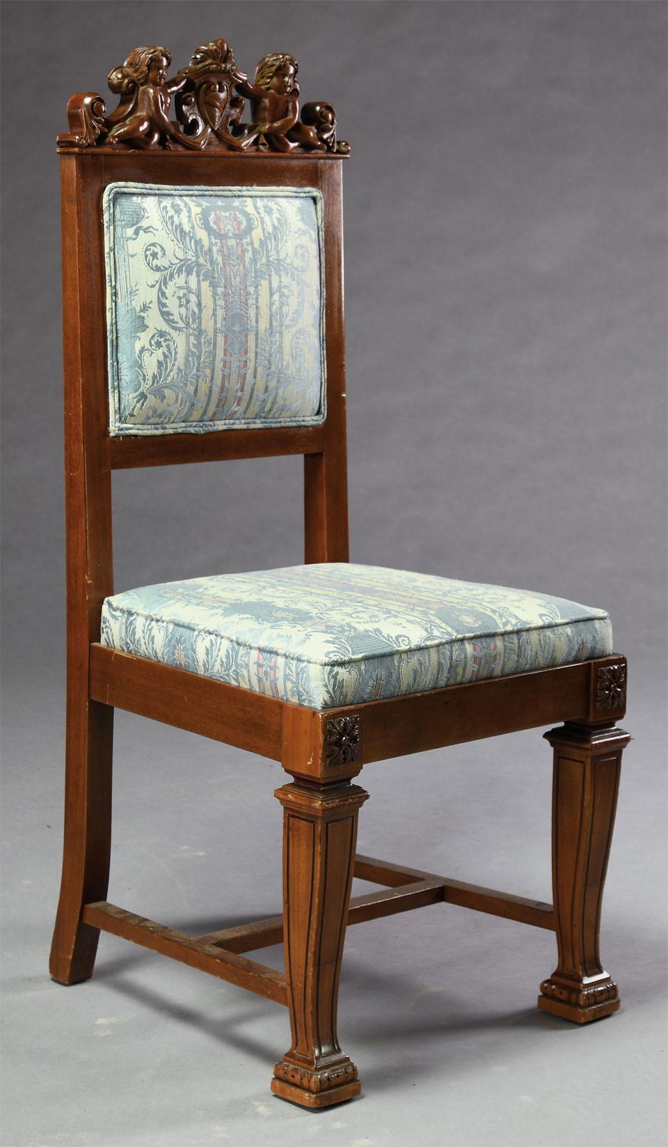 5) Set of 6 matching carved side chairs, each with crest featuring two cherubs and shield carving. The chairs have pastel blue upholstery, each having slip seats.