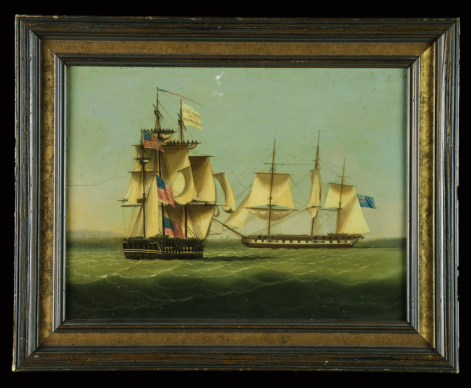 Circa 1812. War of 1812, American 3 masted ship flying the Free Trade flag sailing towards a British naval ship. Housed in wood frame with gold tones. SIZE: overall 14″ x 17 1/2″, sight 10 1/2″ x 14″.