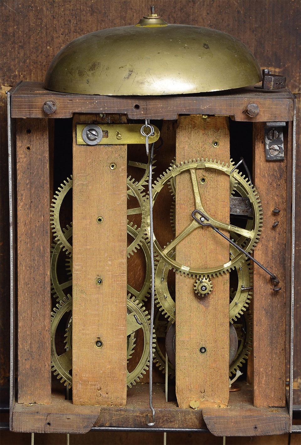 Early 19th century Berks County, Pennsylvania. The tall clock with dovetailed bonnet and swan’s neck pediment with reeded finials and arched glass door flanked by colonettes. The narrow throat with “tombstone” door above the molded waist on a box base with inset panel raised on ring, turned short legs. The painted wood dish dial, floral decorated in the arch, and with cinnabar painted floral spandrels in the Pennsylvania Dutch taste. The dial with Roman numeral chapter ring. The brass movement with time and strike, weight driven mechanism striking on a bell. Possibly a Black Forest German movement. Clock is offered with pendulum, bob, two weights, winder, and door key. SIZE: 66″ h x 11″ throat x 9″ d.