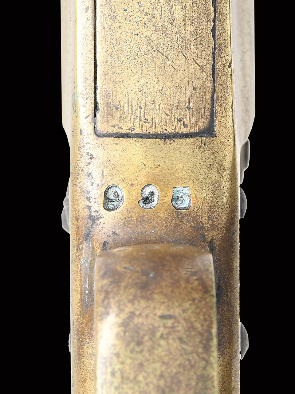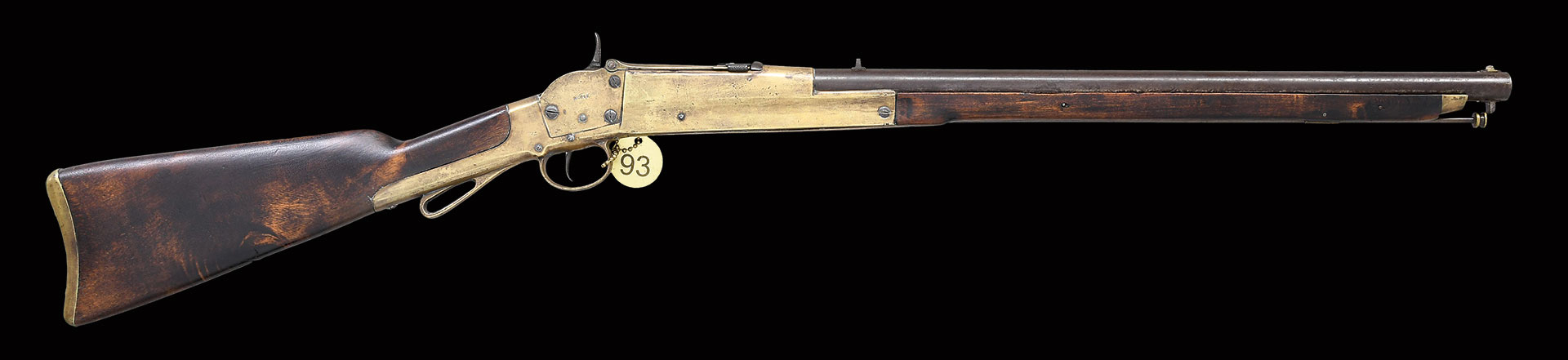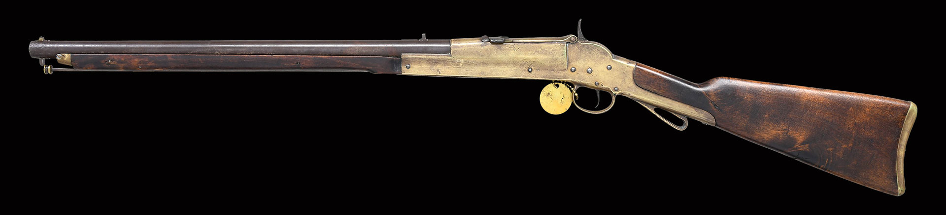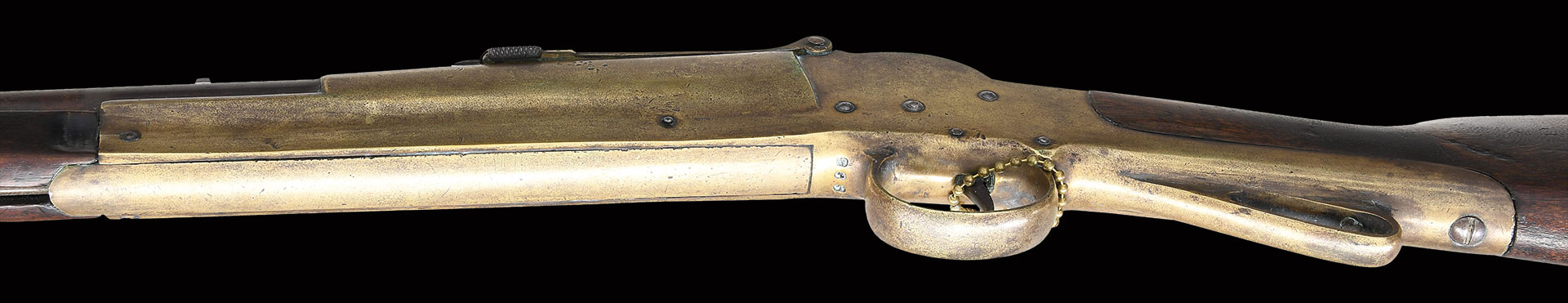 Brass framed, breech loading Morse carbines were made in Greenville SC, 20″ round barrel, 39.5″ overall. About 1000 were made and only 4 or 5 examples are known marked “MORSE”. These few marked guns are generally mixed numbers around serial number 1000. This is only example I am aware that is all matching and also the lowest serial number known marked “MORSE”.