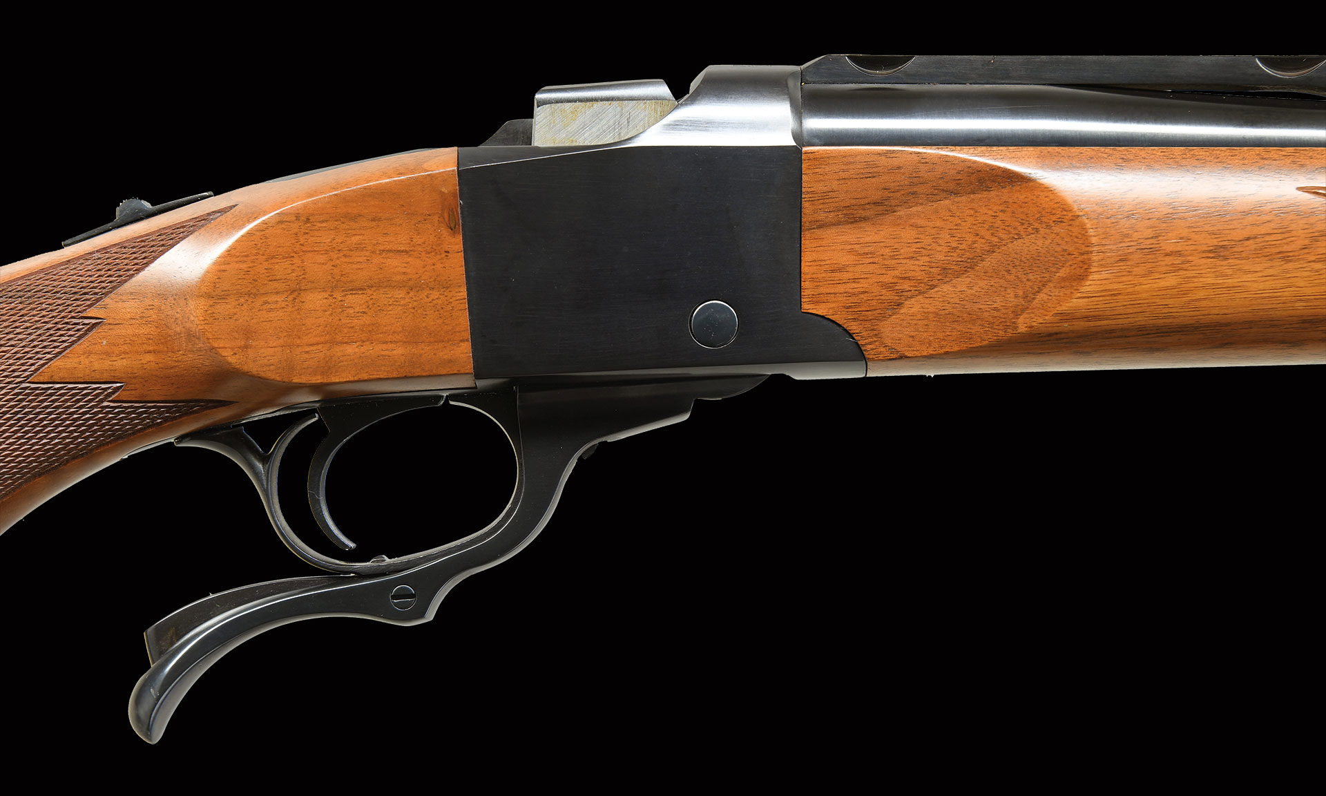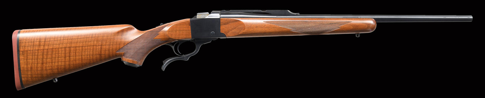 UNATTACHED ACCESSORIES: letter from Sturm, Ruger & Co, Inc., certifying this firearm was a part of the Ruger factory collection. The letter details the following information, “Model: Ruger No. 1 Standard Rifle / Serial Number: 61D / Caliber: .280 Remington / Testfire Date: February 23, 1971 / Special Features: This is likely an engineering sample as the .280 Rem. caliber was first listed in the 1969 Ruger price sheets as a special order item with a longer barrel option. This caliber did not appear again until the 1980 Ruger price sheets as a caliber option for the No. 1-B and No. 1-V models. The ‘D’ to the right of the serial number indicates a duplicate serial number. ‘STURM, RUGER & CO. INC., SOUTHPORT, CONN. U.S.A.’ is stamped on the top of the barrel. It has a 22 inch barrel, a beautiful American walnut stock with a satin finish, and a red rubber buttpad with embossed Ruger eagle logo. The pistol grip and semi-beaver-tail forearm are hand-checkered to a borderless design. Ruger scope rings can be mounted on the quarter rib”. Also includes original box w/ matching serial number. Box contains instruction manual, registration card, NRA card, Ruger rings, trigger lock, sling swivels & allen wrench. Serial numbered travel ticket dated 6/23/06 w/ gold Ruger Archives loan tag.