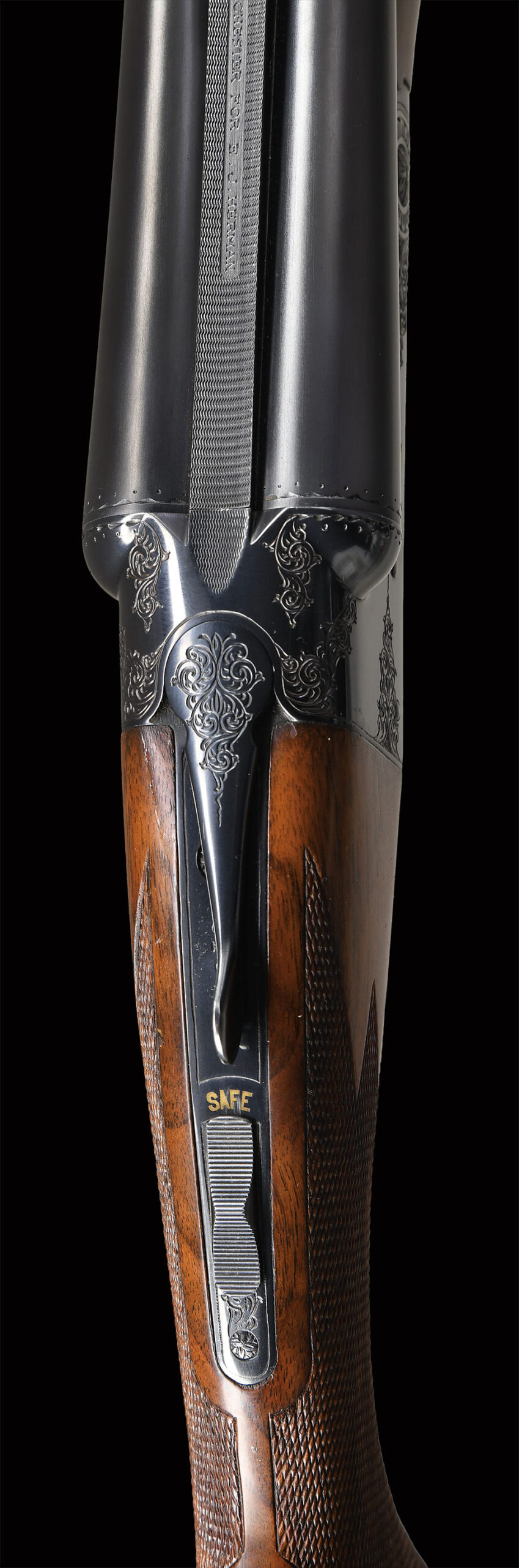 Bbl. 30″ with matte rib having improved mod and full chokes. White Bradley style front sight. Top of rib is marked “CUSTOM BUILT BY WINCHESTER FOR E.J. HERMAN”. Flatside action with no. 1 factory engraving. Gold finished single selective trigger. Selective ejectors. Water tables of bbls. and frame along with inside of forearm and ejectors are machine jeweled. Ebony tipped beavertail forearm and steel capped pistol grip stock of fancy walnut with point pattern checkering. Toeline of stock has gold presentation plate with initials “E.J.H.”. LOP: 14″ over original red ventilated Winchester pad. DAH: 2 1/2″. DAC: 1 9/16″.