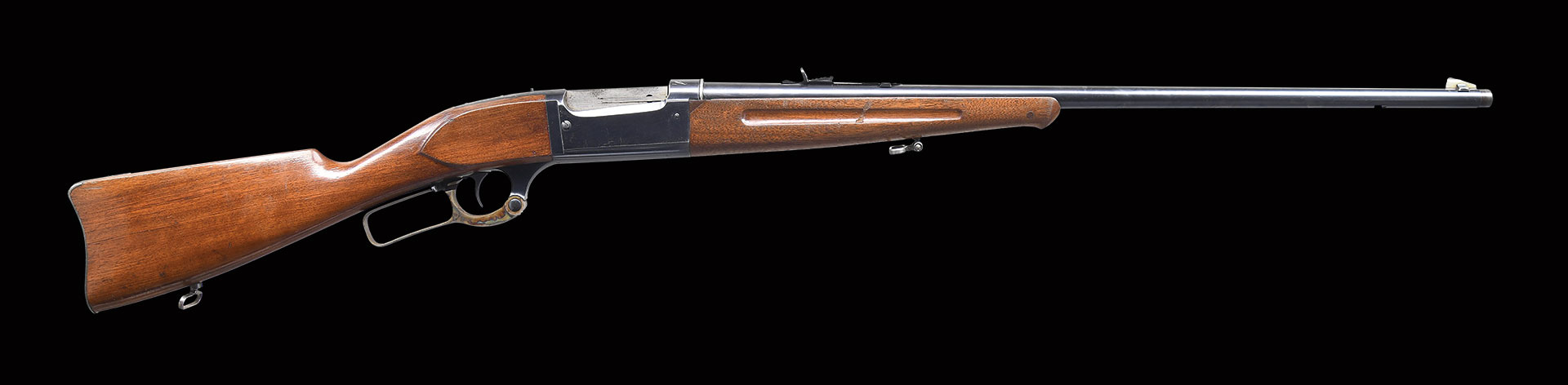 Canada entered WWI alongside Great Britain in August of 1914. Canada’s small regular military & national guard were sent to Europe, leaving primarily men over age 40 at home. Many jurisdictions formed their own Home Guard units to protect against invasion by the Germans. Prominent citizens of Montreal, Quebec, formed a Home Guard unit in 1914. As most suppliers of rifles had military contracts, the Montreal Home Guard turned to Savage for suitable arms. These were musket configuration. Bbls. 28″ w/ turn down muzzles for bayonet attachment. Features included blue finish w/ case colored levers, pin type cocking indicators & brass rotary mags. w/ left side cartridge counters. Full length finger groove forearms w/ hand guards & straight grip walnut stocks w/ steel musket buttplates were standard. Other features included military ladder sights & sling swivels. This rifle is fitted w/ a German silver blade front sight & elevator adj. sporting rear sight. Buttplate peaks had rack numbers stamped by Savage, the highest number observed is 1,015. This rare rifle has rack number 500. This rifle differs from the standard Home Guard gun in having a sporter length schnable tipped forearm w/ finger grooves. This forearm has a plugged hole in the approx. position of the bbl. band w/ forearm mounted sling swivel. Serial numbers range from 162,000 to 175,500. The first shipments were in early December, 1914. Shipments of serial numbers in the 165,000 range arrived on three consecutive days in late December, 1914. Final shipments arrived in April, 1915. CONDITION: over 90% bright blue showing small scratches & marks on receiver. Lever retains 80% case colors. Buttplate retains 50% fading blue. Stock has original finish showing wear spots w/ scattered handling marks & a hairline crack behind the top tang. Forearm has worn finish w/ added wood repairs along bbl. line at both sides of receiver. The metal hand guard retainer is trimmed flush w/ the receiver. Bbl. is bright w/ very good rifling.
