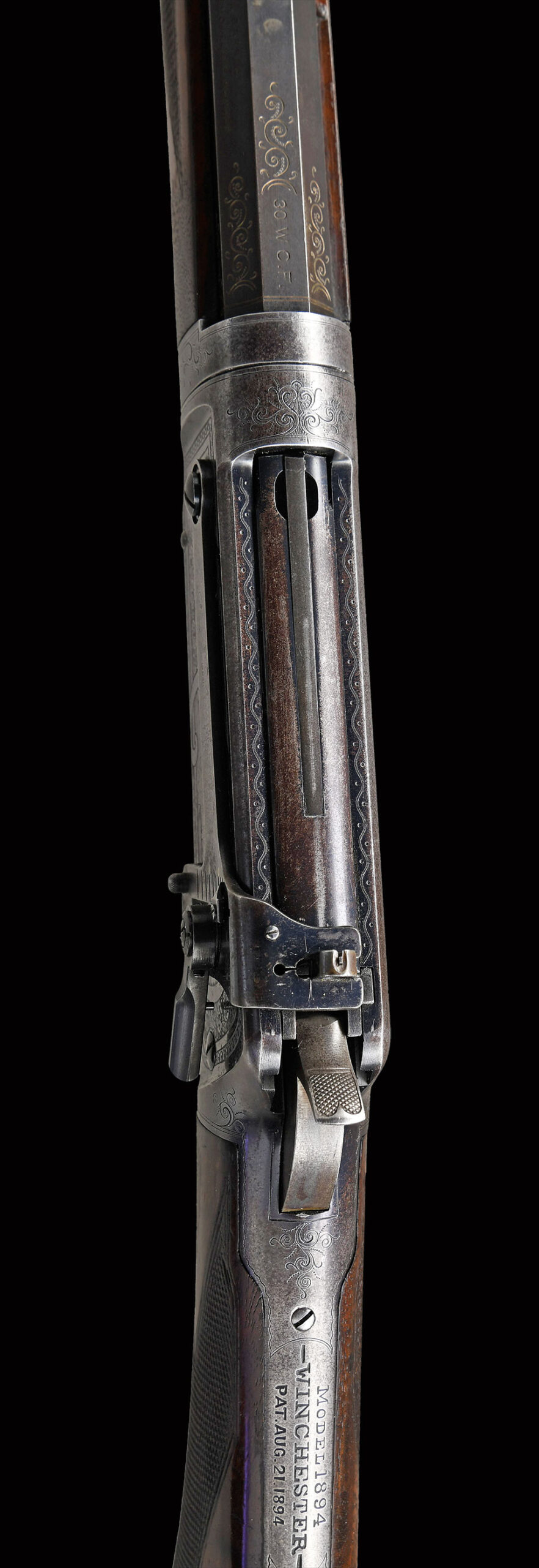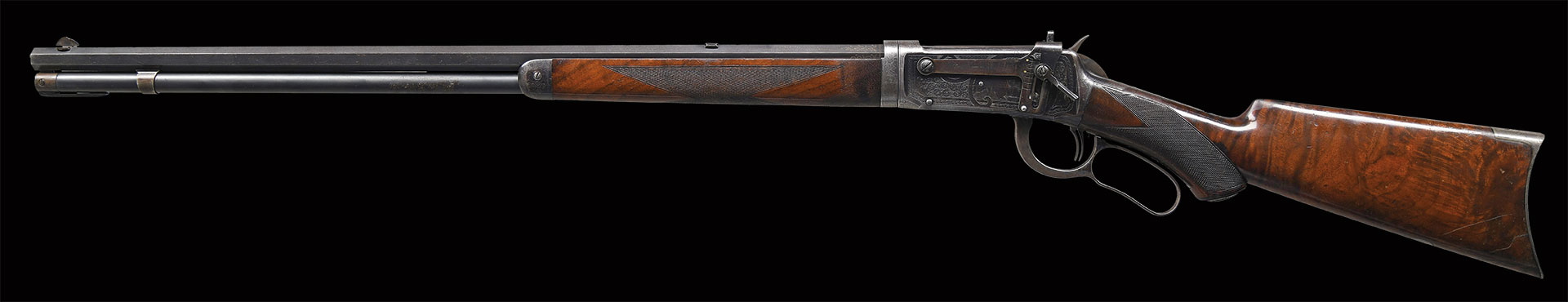 Bbl. 26″ octagon. Lyman no. 4 hunting sight w/ filler in rear dovetail & no. 21 “Climbin Lyman” receiver sight. Full length takedown mag. Action has no. 6 engraving featuring vignettes of deer on right & bighorn sheep on left. Scenes are surrounded by arabesque scroll & fancy borders. Complimenting engraving extends to upper & lower action areas along w/ bbl. extension, breech end of bbl. & crescent steel buttplate. Although the letter does not state factory engraved, this engraving is undoubtedly period and done in the hand of Ulrich. “WINCHESTER ENGRAVING” by R.L. Wilson states 378 model 1894s in the serial number range 1-353999 were engraved and only 25 featured No. 6 engraving. Rifle features include double set triggers. Forearm & hard rubber capped pistol grip stock of XX fancy walnut w/ style “H” factory checkering & German silver nameplate in toeline. Left inside of lower tang is marked w/ assembly number “15557” followed by wood grade marking “XX”. Back of stock is stamped “94/T/15557”. Floorplate of rifle is engraved initials “C.F.L. / Chicago, 1902”. John Fitzpatrick was an organizer of the Chicago Federation of Labor “CFL”. He served as President of the CFL in 1900 & again from 1906 until his death in 1946.