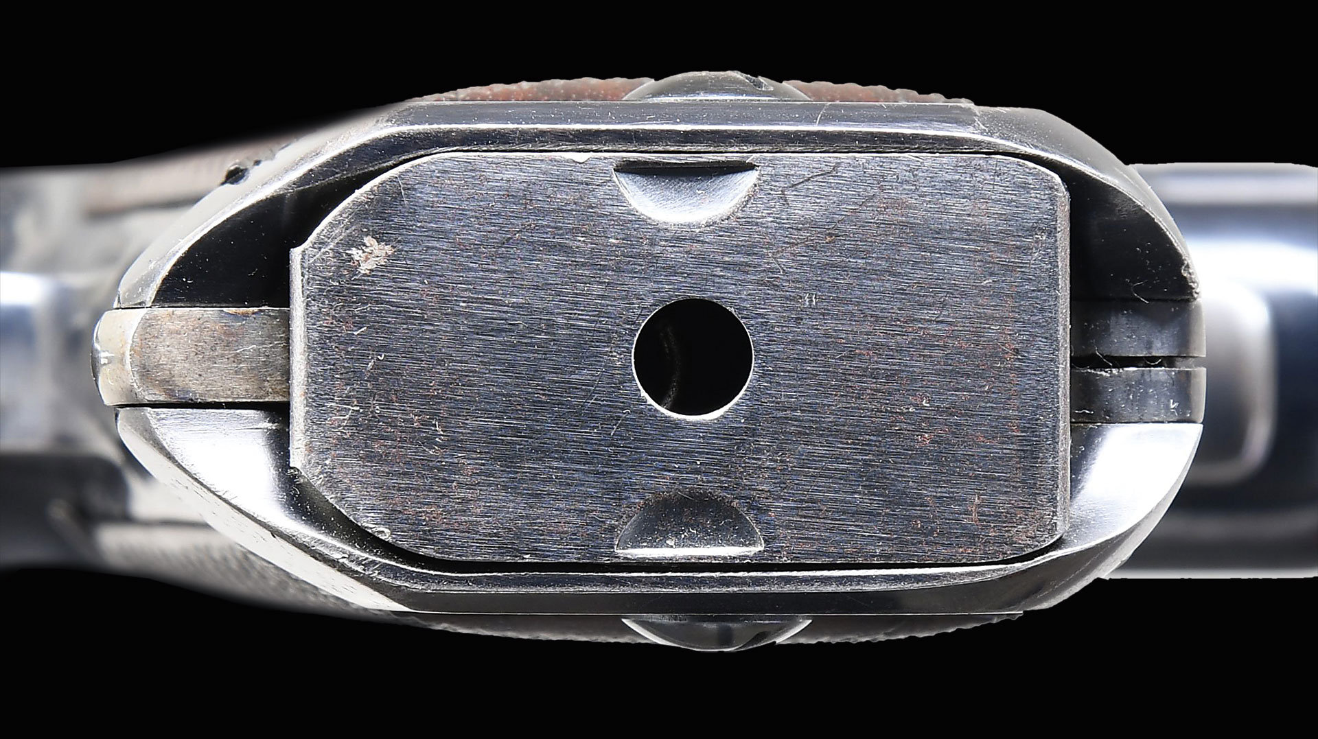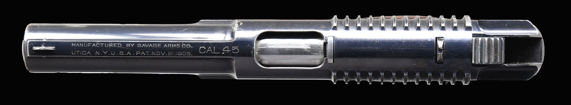 Exceeding scarce, original finish Savage .45 ACP as tested by the US military against the Colt. One of approximately 300 pistols made between 1907-1911 and one of just a handful of all-matching pistols with its original high polish finish. Well documented, with citation by SN in U.S. Military Automatic Pistols 1894-1920 by E. Scott Meadows on page 261 and appearing in full color on the dust jacket’s back cover. After US testing, the vast majority were reconditioned by Savage, a process that included the removal of most of the slide address, leaving only the CAL .45 marking, and refinishing the pistol with a matte blue. This particular gun is exceptional in having avoided that refurbishment, still appearing as per its original submission with full address two-line address on barrel rib referencing manufacturer, location in Utica, N.Y, and 1905 patent date suffixed by CAL .45. Safety detents marked “FIRE” and “SAFE”. Fitted with fully checkered walnut grips and magazine whose body is correctly in-the-white having a blued floorplate. Rack #36 stamped on top of left grip. Major components finished with Savage’s brilliant high-polish blue; barrel is in the white; trigger and magazine release lever are color case hardened. Detailed disassembly shows a fully matching gun, the sight bar overstamped 224/151, both grips factory matching as is the magazine.
