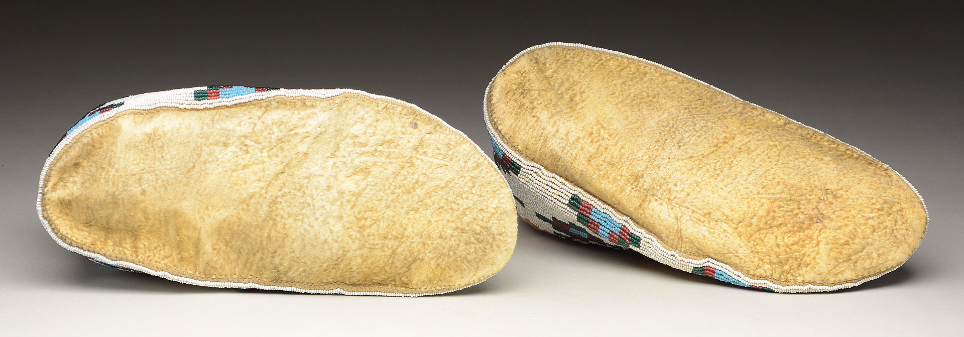 9.5″, beaded tops, sinew sewn, geometric designs, white-heart red, sky blue, & green beads on white ground with worn red velvet cloth trim.