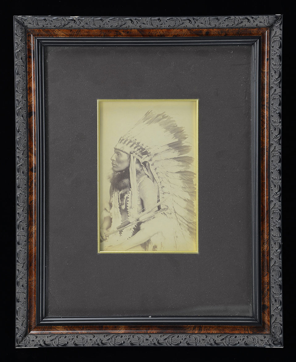 5″ x 7.5″ exposed albumen image in frame, unusual profile view, distinguished Native American chief with fur collar and full eagle feather headdress holding bow and arrows.