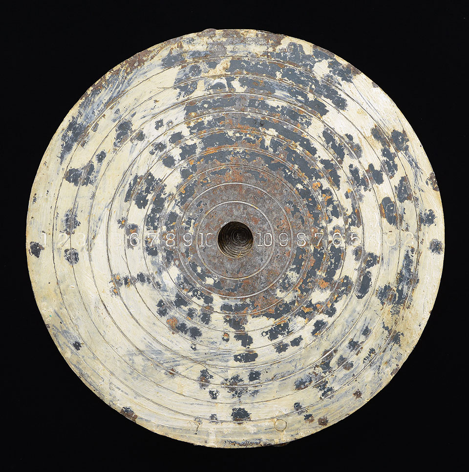12″ heavy steel concentric bullseye target, if a shot hits the bullseye in the center, a bell is wrong and painted steel duck appears above the target. Mechanism on reverse, with 3″ pasted label of Quackenbush patent and manufacture, Herkimer NY, circa 1900.