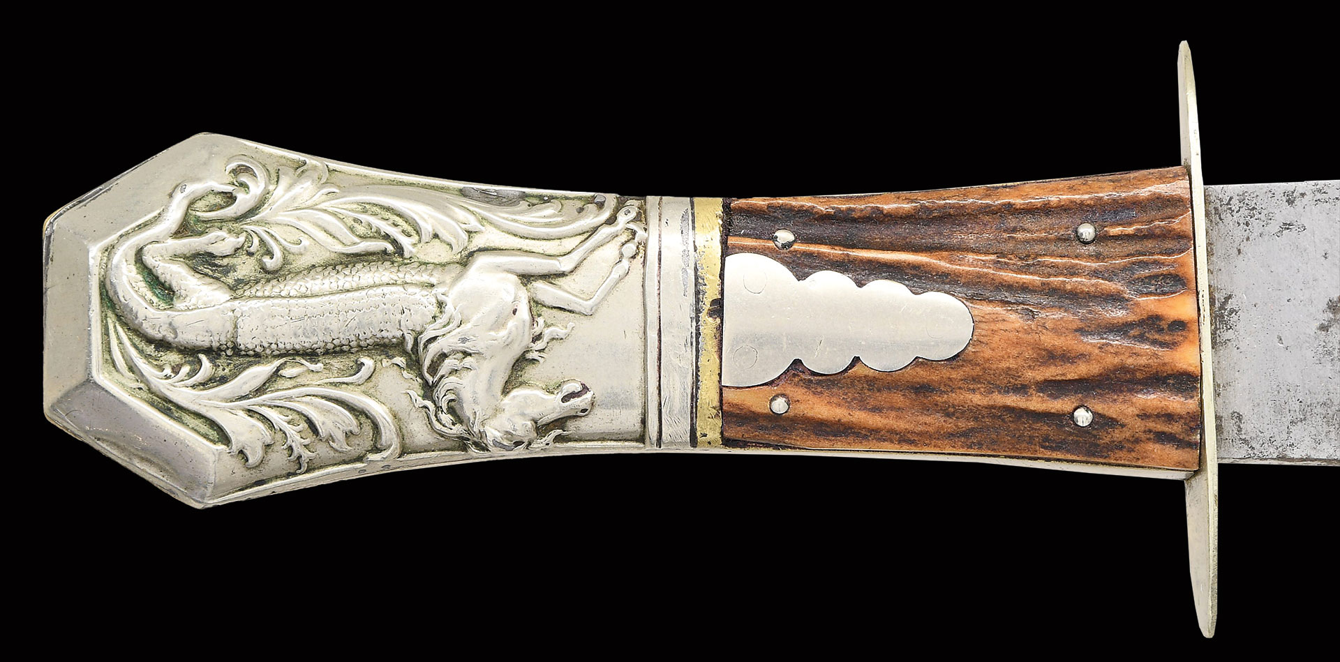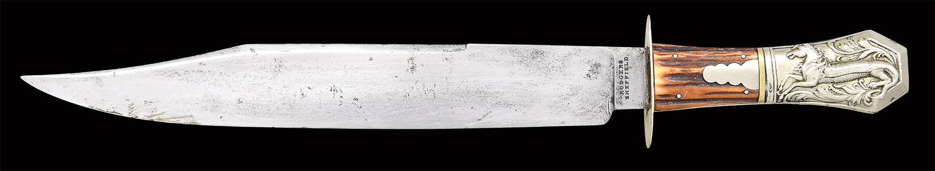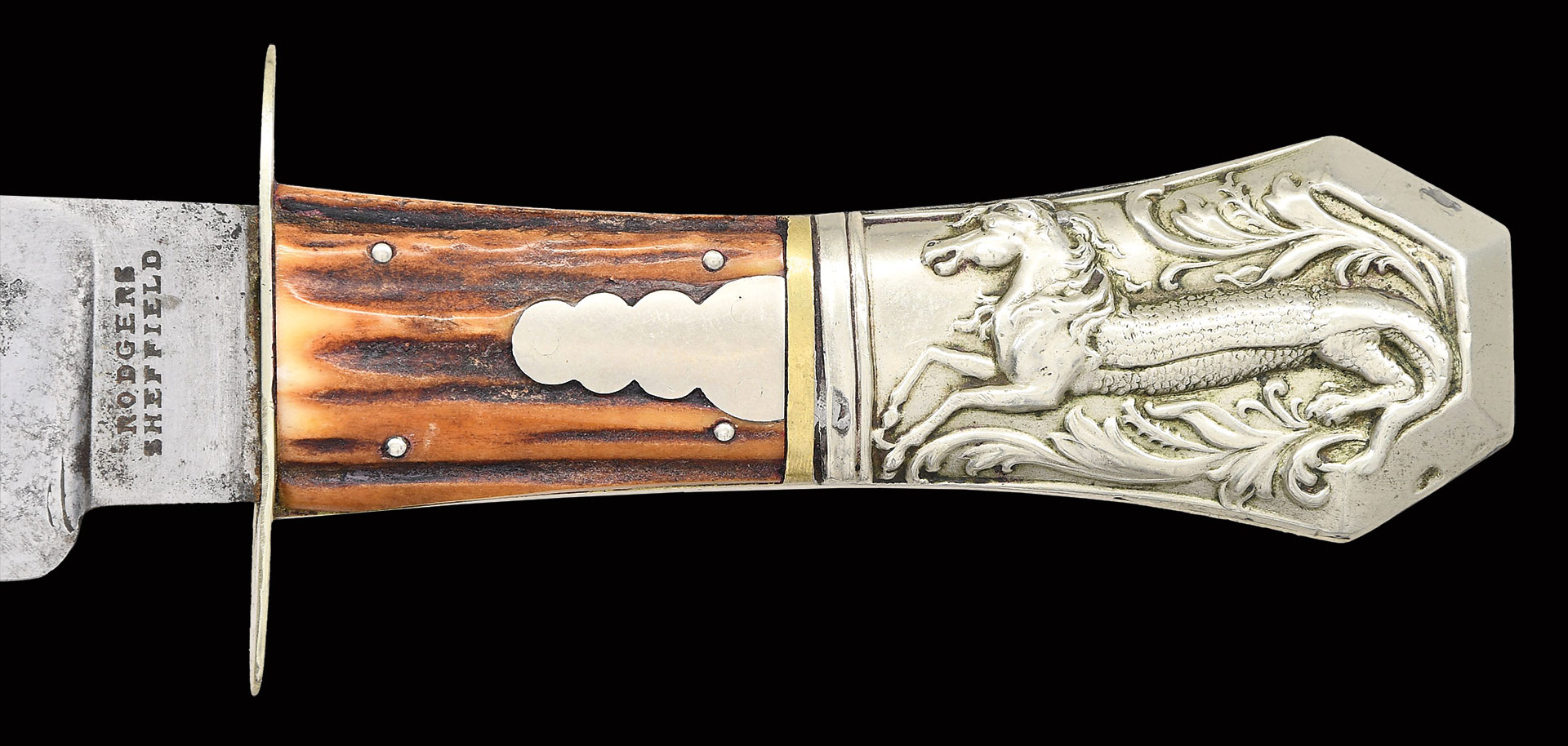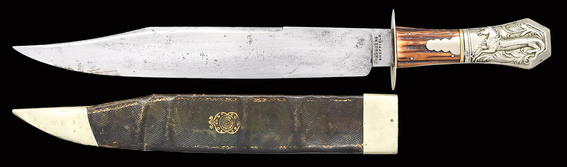 14.5″ overall, 10.25″ clip point blade, beveled top edge, “ROGERS / SHEFFIELD” stamped on ricasso, stag slab grips, German silver escutcheons, half horse-half alligator solder filled pommels. Original gilded veneered cardboard sheath with German silver throat and tip. PROVENANCE: Norm Flayderman; Martin Lane Historic & Western Americana Lifetime Collection.