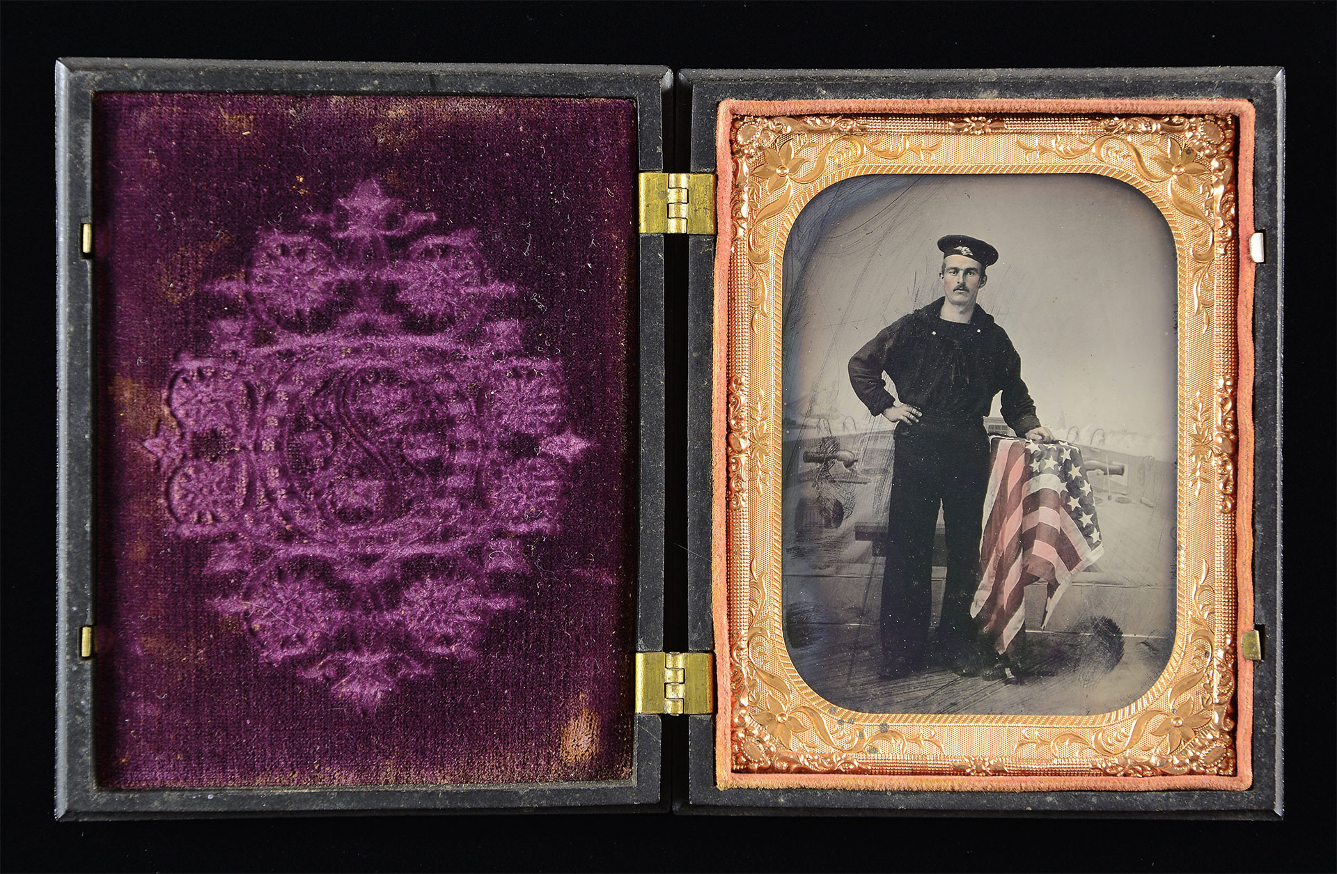FINE QUARTER CIVIL WAR TINTYPE OF US SAILOR WITH TINTED AMERICAN FLAG
