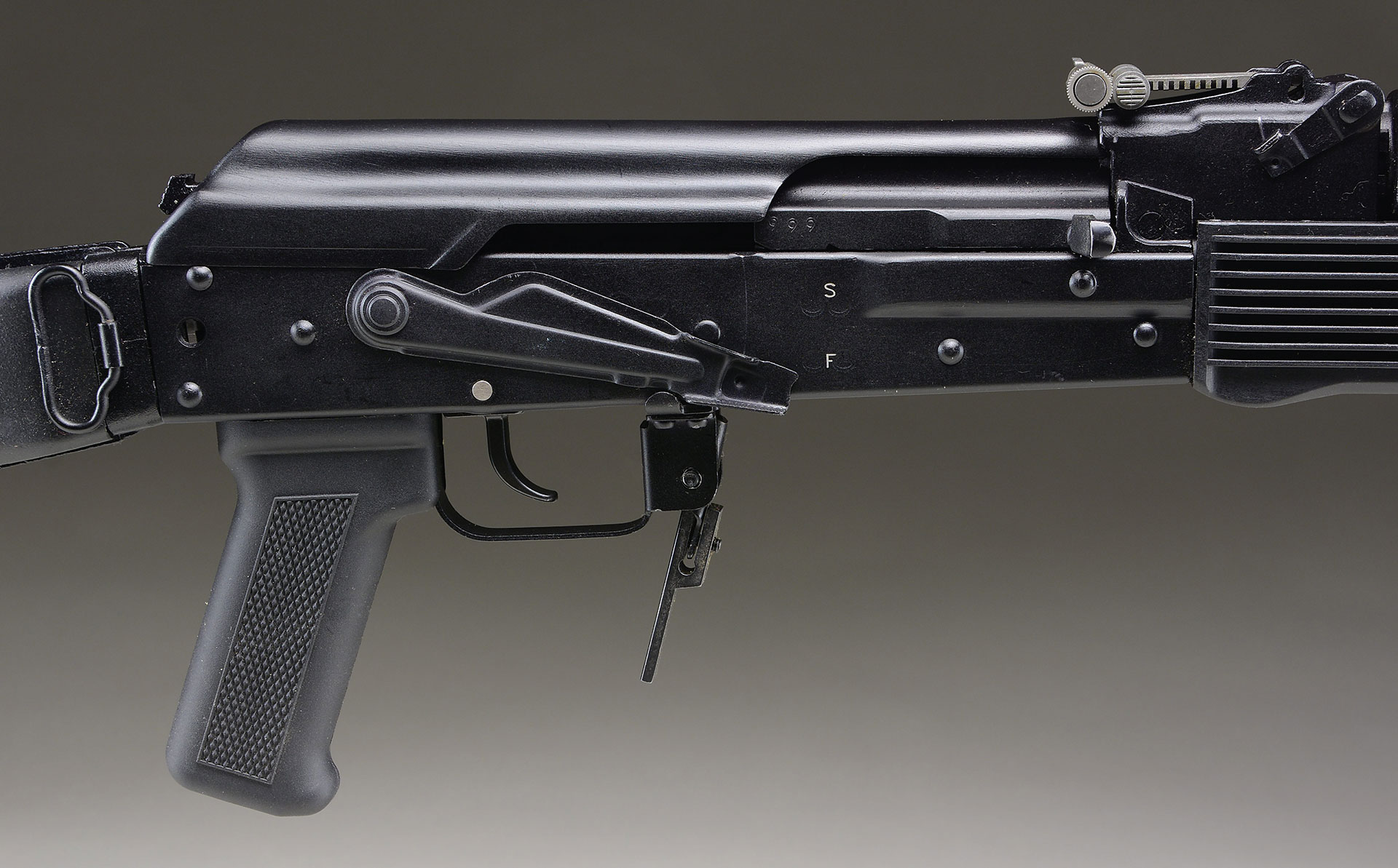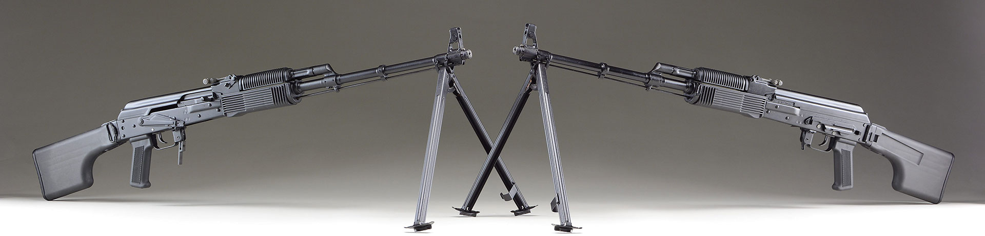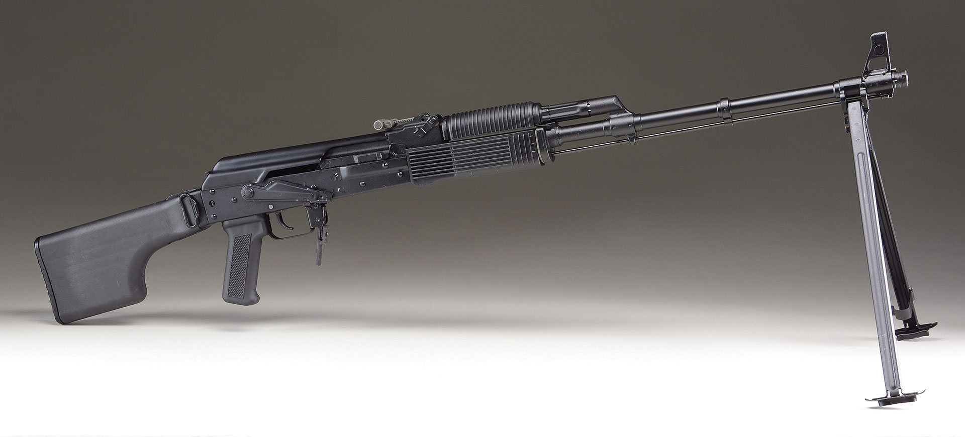 Bbl. 23″. This rare & desirable Russian RPK variant chambered in 5.45x39mm is one of the last guns of this type to make it through customs due to the previous ban. A real Russian semi-auto RPK, not a fantasy based assembled parts kit. Manufactured. in the famous Molot plant where the originals were born. The military guns manufactured for the Soviet Army during the Cold War put these on our radar & were fortunate to have the real deal available here. The 23.” hammer forged, chrome lined barrel is terminated w/ a left hand thread & flush thread protector just forward of the locking RPK bipod. The long cleaning rod is held captive below the barrel. Left side folding polymer clubfoot stock. Matching plastic ribbed RPK handguards. Left side factory scope mt. Protected post front sight & RPK exclusive windage & elevation adj. rear sight marked 100 meters to 1000 meters. Right side safety/selector.