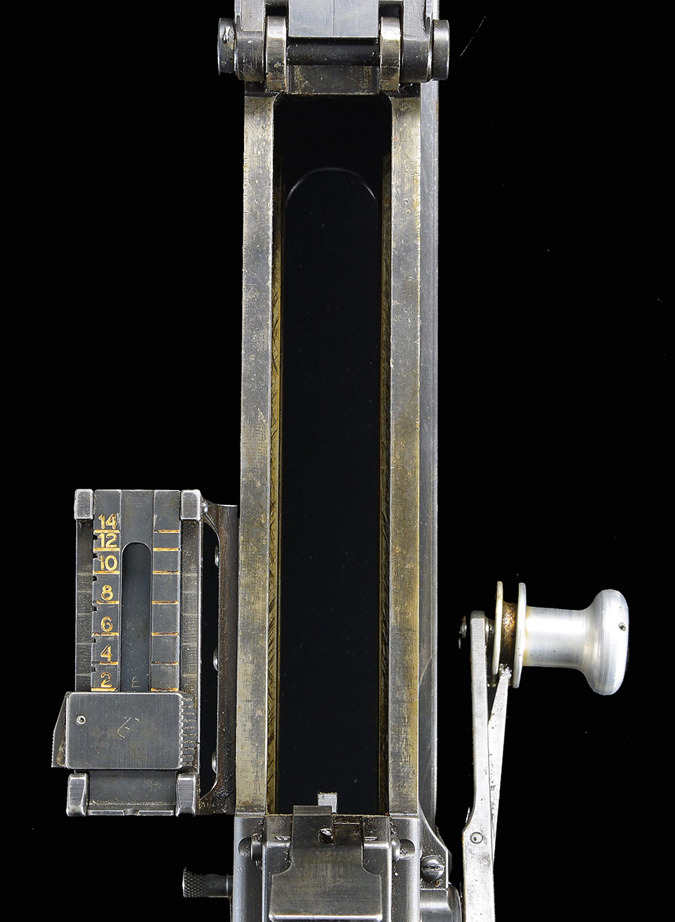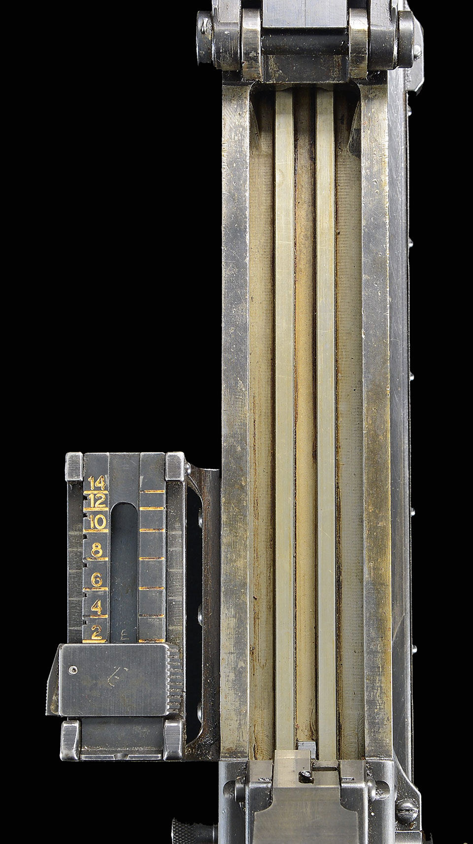 It is rumored that though these were designed to fire only a single shot per function of the trigger, it wasn’t uncommon for a malfunction to operate as a fully automatic, surprising the shooter w/ a burst of fire. Though these guns were a little late for the Winter War of 1939/40, a few were said to have been deployed though there seems to be no official record of their performance. Ski style bipod has 2 positions, the other w/ stakes to grip the ground when deployed on a harder surface than snow. The overall length is 86″ w/ 55″ of it being barrel alone. Threaded muzzle, sporting the factory 10 chamber muzzle brake measuring over 5″ in length itself. It includes the original steel muzzle brake cover that snaps in place to help keep debris out of the barrel. The sights consist of a protected post front blade and the rear sights are a tangent sight , elevation adjustable from 200 meters to 1400 meters. The enormous mag-well is located on top of the action and feeds down, w/ the ejection port below the action in front of the trigger guard. (It is VERY important to NEVER have a body part in the way of the ejection path due to the size & velocity of the empty casings being ejected). When not being fed ammo, the mag-well has a dust cover that locks closed w/ the mag release to keep the action free from debris.