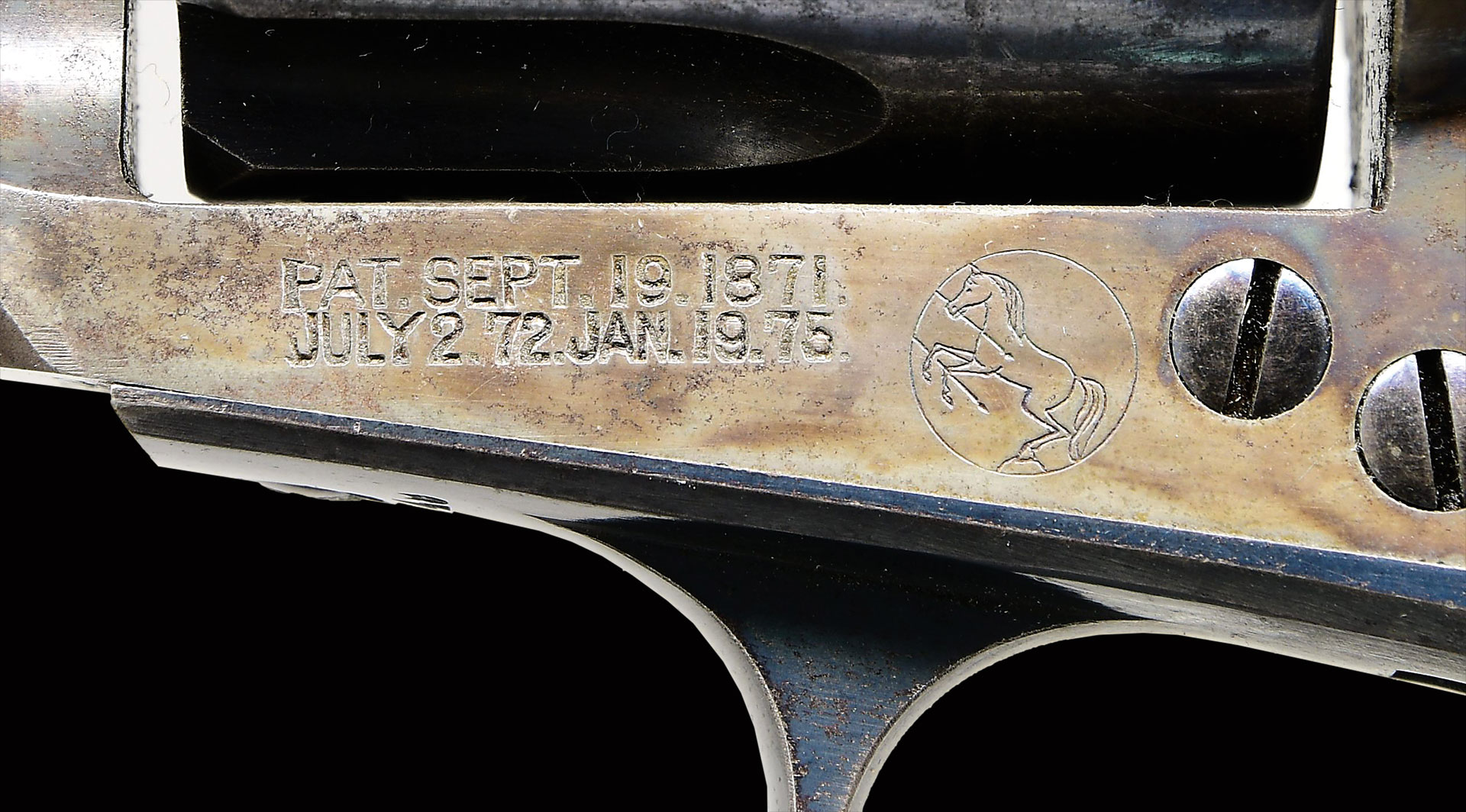 Bbl. 3 1/2″ with blade front sight. With an estimated total production of approx. 1,000 Sheriff’s models, these revolvers are considered very rare & desirable. “Colt Peacemaker Encyclopedia Vol. I” By Keith Cochran estimates that of the total production of Sheriff’s models, a mere 305 were manufactured with 3 1/2″ bbls. Additionally, Cochran estimates that the total production of Sheriff’s Models chambered in 41 Colt accounted for approx. 3.25% of the total (32 Revolvers). “THE OFFICIAL RECORD OF THE COLT SINGLE ACTION ARMY 1873-1895″ by Don Wilkerson, Carol Wilkerson & Colt Historian Kathleen Hoyt lists on page 350 that from serial numbers 1-164100, just 33 ejectorless SAAs were found to have been manufactured in 41 Colt and those, the number manufactured as blue with a 3 1/2” bbl. was only TWO! Second style black powder frame. Though research would have S# 183449 listed as 1899 mfg, it is noted in “A STUDY OF THE COLT SINGLE ACTION ARMY REVOLVER” by Graham, Kopec & Moore on page 69 “It has been observed that in the regular Single Action production the spring loaded cylinder pin release catch occurs near the 165,000 SNR. However, with Storekeeper’s Model production, it is noted that some revolvers in the 183,000 range, and possibly higher, retain the old style cylinder pin screw of the blackpowder frame. This is due, no doubt, to the aforementioned practice of over-producing a number of frames for stockpiling. Black powder frame Sheriff’s models were still being assembled and shipped from the factory in 1899. This is three full years and approximately 18,000 revolvers after the production of all standard Single Actions had changed over to the cylinder pin release catch. Blued grip frame, 6 shot fluted cyl. & bbl. Case hardened frame & hammer. 2 line patent date. 2 line bbl. address. Left side of bbl. marked “41 Colt” Bottom of bbl stamped with small “41” 2 Piece checkered hard rubber Rampant Colt grips.