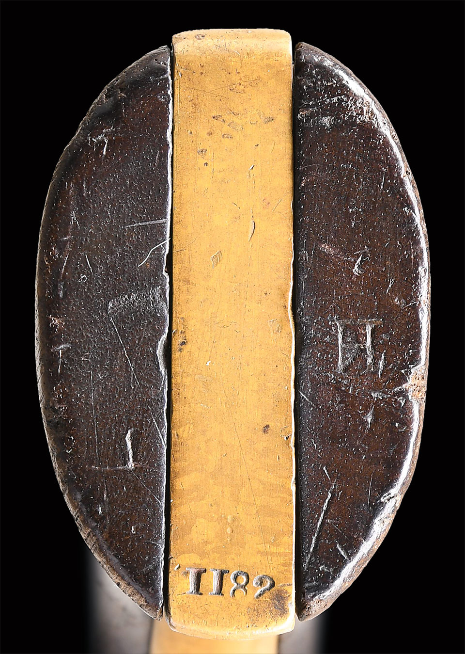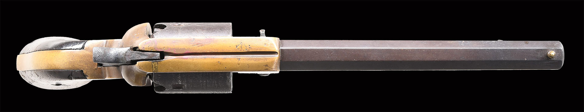 Classic Confederate brass frame copy of a Whitney navy revolver made in Atlanta/Macon, GA. 7″ octagonal barrel. Serial numbers are all Atlanta die fonts. Cylinder and loading arm are from Whitney with Whitney serial numbers still discernible. The color & patina of the 2 Whitney parts match rest of gun and could be wartime alteration as Spiller had numerous cylinders fail. This revolver was made in Atlanta in late 1863 but failed inspection, it was one of about 400 unfinished revolvers sent to the Macon Armory in January 1864 after CS government purchase. It was finished and issued in Macon, Macon inspection on frame “E” and in grips “H”. There are several other revolvers in this serial range all Atlanta made and Macon issued. There are 3 higher serial number guns issued in May 1864 listed on MSK list 1219, 1223, & 1237. This is an interesting, attractive & original Spiller & Burr with probable wartime alteration to cylinder & loading lever.