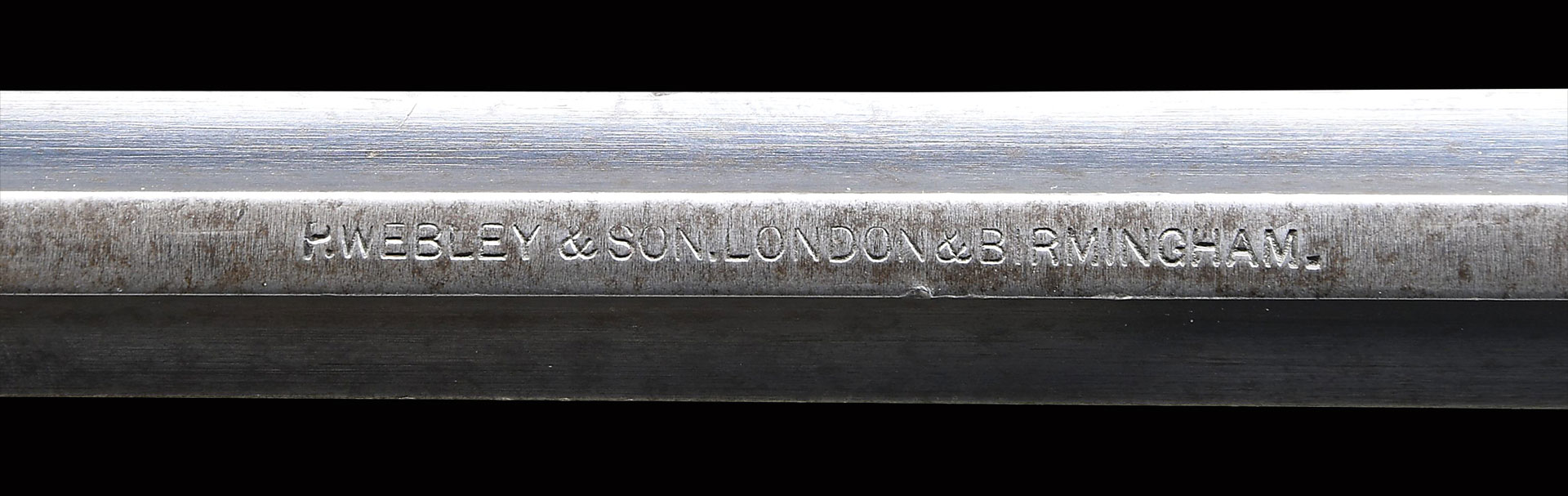 Bbl. 7 1/2″. Webley Fosbery automatic revolver, mfg. by Webley & Son. The left sideplate is marked with the Webley winged bullet logo above “W&S”, followed by “455 CORDITE”, with the S# “2316” and a Crown/BV Birmingham Proof house proof marked on the right sideplate. The top of the solid bbl. rib is marked “P. WEBLEY & SON. LONDON & BIRMINGHAM.”, with “WEBLEY FOSBERY” marked on the left side of the top strap. Cyl. exhibits Crown/BP and Crown/BV Birmingham proofs. Metal components exhibit a blue finish overall. Frame is mounted with 2-piece checkered vulcanite grips. Lanyard loop is present on the butt. Pinned blade front sight (rear face of blade painted yellow), with U-notch rear sight. All serialized components are matching and include the frame (below the left grip panel), left sideplate (interior), safety lever, right sideplate (exterior), serialized internal components, bbl., bbl. latch, as well as the cyl.