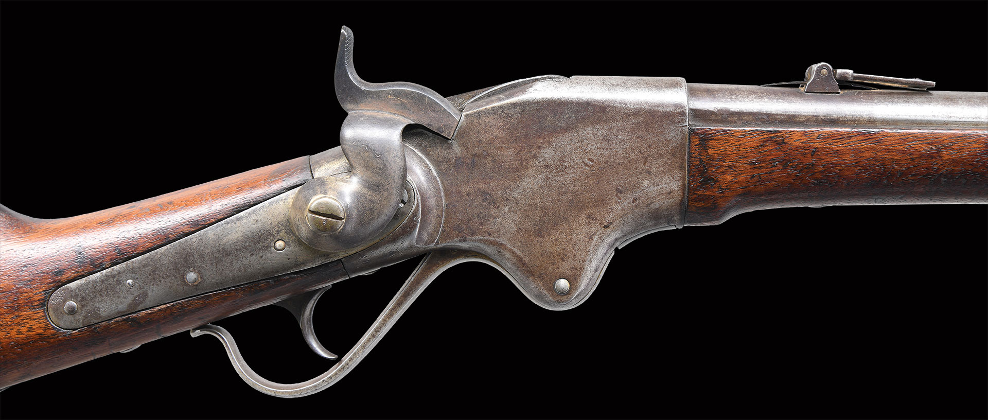 Standard configuration of the Civil War model, 22″ 6 land and groove rifled barrel, adjustable rear sight, top of breech: “SPENCER REPEATING / RIFLE CO. BOSTON MASS / PAT’D MARCH 6, 1860”. Over 90,000 were purchased by the government as the Spencer proved in the field that is was the first repeater rugged enough for military service. So formidable was its rapid fire that it was named the “horizontal shot tower” by the Confederates. The heavy casualties at Chickamauga inflicted by the Spencer rifles of Wilder’s’ brigade proved the value of the repeater in war. The many battlefield captures of Spencers by Confederates could often not used due to lack of cartridges. Copper was scarce in the South & one hundred percussion caps could be made from the metal required for one Spencer cartridge. Cavalry units from Michigan, New York, Wisconsin, Indiana, Connecticut, New Jersey, Ohio & Massachusetts were equipped with Spencer carbines. This is a nice complete & honest example of the most popular Civil War used carbine showing honest use and saddle wear.