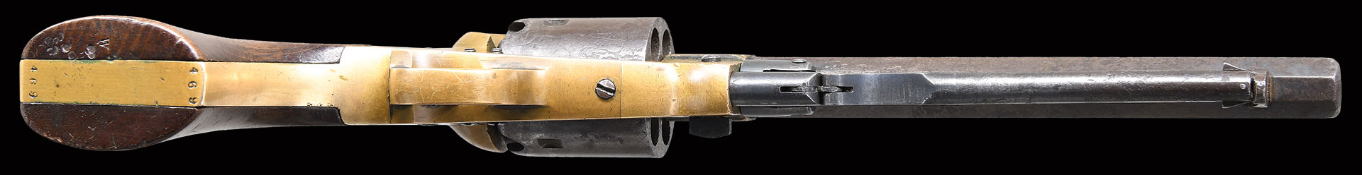 This rare Confederate Macon Armory issued “Spiller & Burr” revolver is in superior condition retaining rarely seen original blue finish. This revolver was one of the last Spiller & Burr Confederate revolvers completed in Macon, GA November of 1864. These last revolvers were not CS surcharged, Government acceptance is noted by “W” inspection in butt and this survivor is listed by serial number in Macon Armory memorandum book as being issued November 18th, 1864. This revolver descended in the family of Capt. George Shuman, 9th Penn Cavalry (1827-1899) who entered service in August of 1961 as a Sergeant staying in service until July of 1865 with the rank of major. The 9th PA Cav was a hard-fought unit engaging successfully against both Forrest and Wheeler, having 6 officers & 166 men killed in action. The 9th entered Macon just 3 days after this revolver was issued, November 21, and took part in the destruction of the Griswoldville Pistol Factory and the battle of Griswold on November 22nd. This revolver is the newest addition to database and first newly discovered Spiller & Burr in several years. It is a wonderful survivor and held by Shuman family till September of this year.