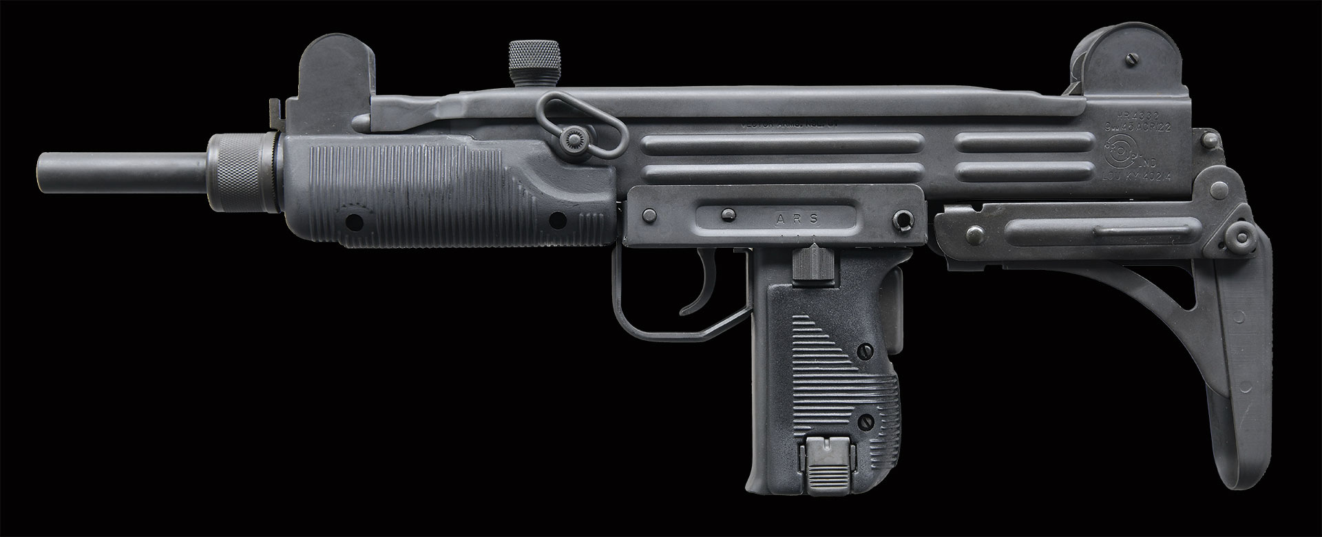 Bbl. 10 1/4″. 1 of only approx. 3,300 Group Industries HR4332 receivers purchased and assembled by Vector Arms with quality South African parts and components. The HR4332 receivers are amongst the most desirable for an NFA Uzi, being specifically heat treated for use as machine guns. This example is stamped “VECTOR ARMS, NSL, UT” on the left side of the receiver, followed by the model and cal. designations, above Group Industries logo and mfg. information. Right side of the receiver is marked with the S#. Selector is marked “A”, “R”, and “S”. Metal components exhibit a parkerized finish overall. Grips and forend are comprised of grooved black polymer. Model A pattern post front sight, with “L” flip-up rear sight, graduated “100” and “200”. Distinctive collapsible Uzi pattern buttstock, with Model B pattern sling swivel, featuring 360 degree rotation. Mag. is absent.