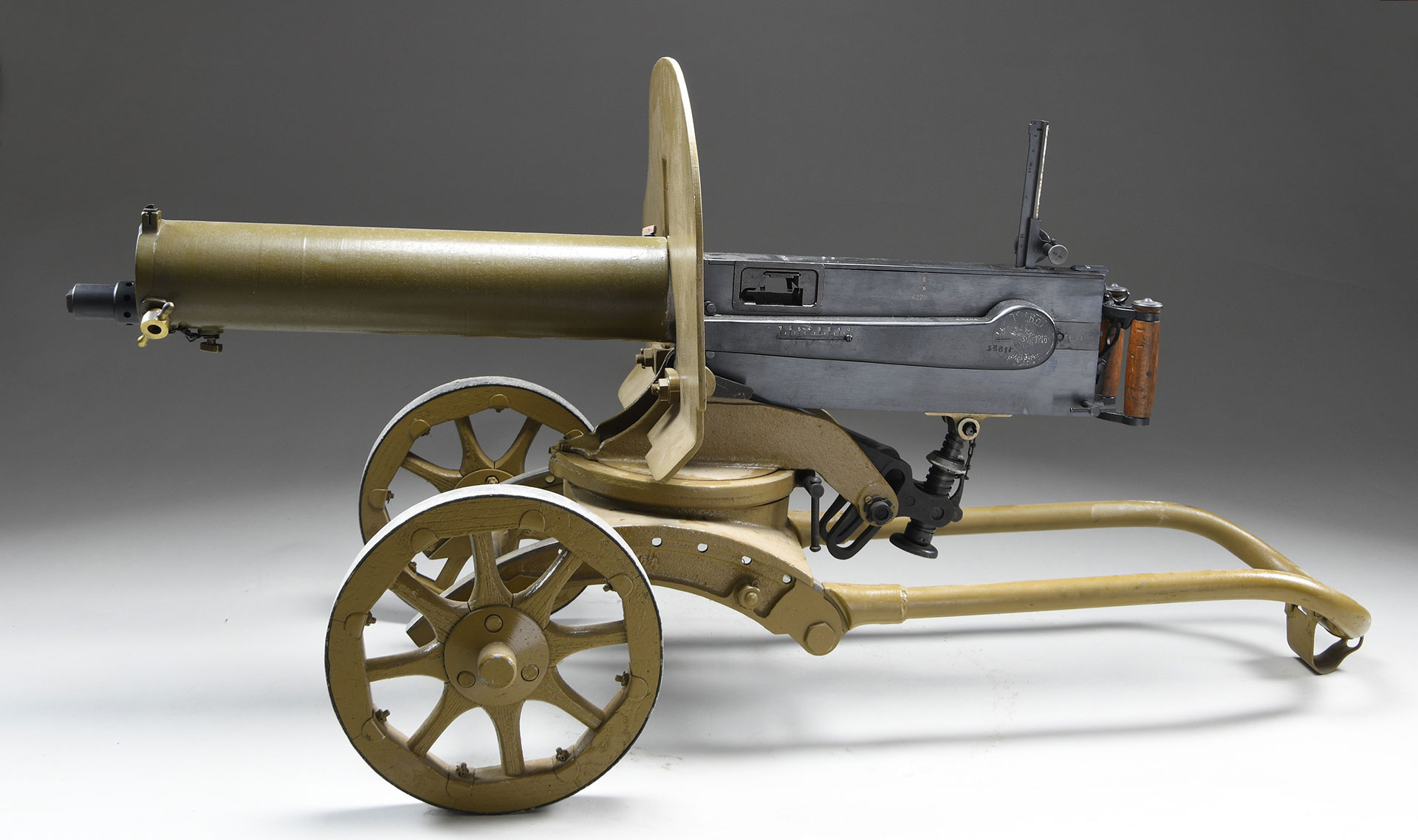 Bbl. 30″. A beautiful example of a WWI German Maxim Machine Gun assembled in the Russian Model 1910 configuration, as reworked by the Finish. NFA Registry lists the manufacturer / importer as “Germany WWI Spandau 1917”. Although the paperwork states 7.92 as the caliber it is presently chambered in 7.62x54R. The receiver & sideplates retain their German markings. The fusee cover is Russian, retaining some of the original nomenclature, highlighted in white for a sharp contrast and easier to read. The Top cover & the majority of the remaining parts are Finish, many bearing matching serial numbers. This example has a smooth water jacket, matching in finish to the armor plate & 1910 Sokolov wheeled mount. Exposed blade front sight coinciding w/ slot in armor plate to line up with the windage & elevation adjustable rear sight, marked from 100 meters to 2000 meters. Blued finish on receiver & all exposed metal parts rearward of the armor plate. Matching painted green finish on water jacket, armor plate & tripod. Hardwood spade grips w/ blued hardware. MAGS: 1 cloth belt w/ brass eyelets & tabs.