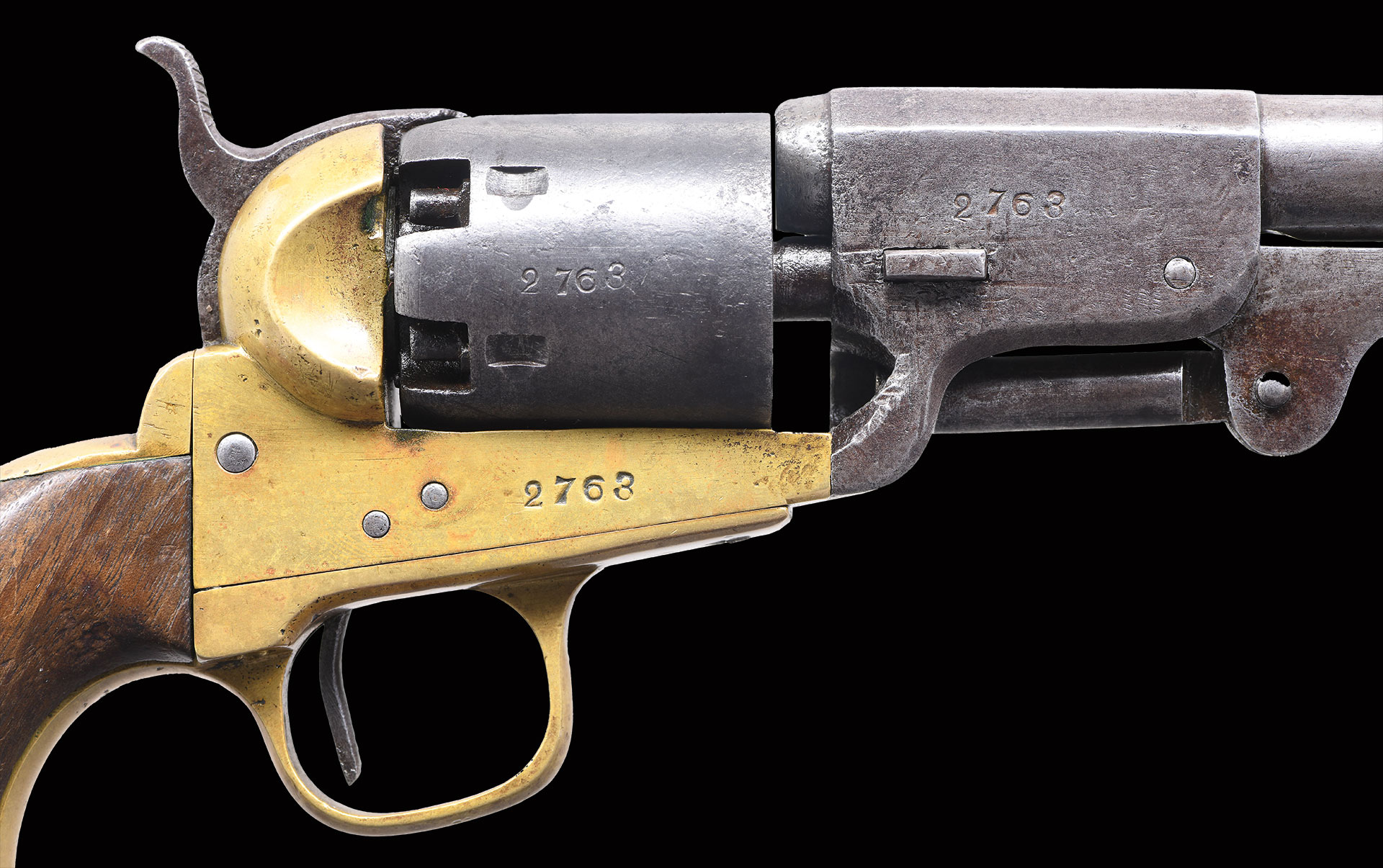 This is a superior standard 2nd model brass frame Griswold revolver with great collection history and condition. It was manufactured mid 1864, and has all characteristics found on Griswolds. Serial number “2763” is stamped on right side of barrel housing, frame, & cylinder. Secondary number “3” found on wedge, hammer, trigger guard, backstrap, loading arm, and bottom of grips. Cryptic backwards “Z” is found on bottom of barrel, back of frame, right side of trigger guard, backstrap & back of cylinder. Roman numeral assembly mark “IIII” is found on frame, backstrap & trigger guard. There are 3 soldier initials in butt “JHJ”.