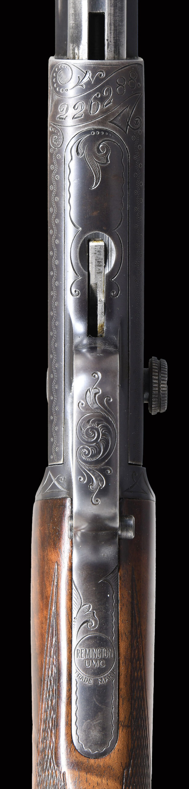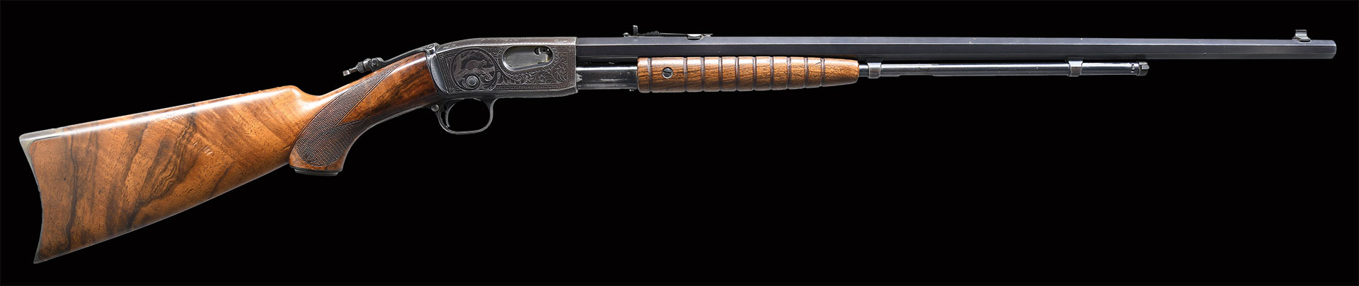 Bbl. 24″ tapered octagon. Lyman bead front sight w/ Marbles elevator adj. sporting rear sight & tang peep sight. Tubular mag. Factory engraved receiver features vignette of squirrel on a branch on right side. Left side scene features 2 cottontail rabbits. Scenes are surrounded by vine type scroll & fancy borders. Complimenting engraving extends to upper & lower receiver areas. Grooved slide handle w/ hard rubber capped pistol grip stock of fancy thin shell walnut w/ crescent steel buttplate. Wrist has point pattern factory hand checkering. Mfg. 1913.