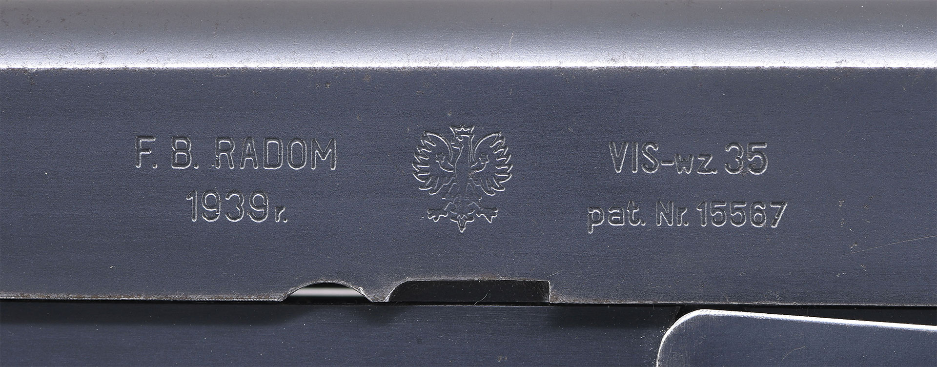 Bbl. 4 5/8″. Starting production in 1935, the wz.35 pistol was issued as Poland’s standard issue military sidearm until 1939. Of the approx. 90,000 wz.35 pistols ordered by the Polish military, only approx. 49,000 were delivered prior to the German invasion and subsequent occupation of Poland in 1939. This example, mfg. in 1939, is marked “F.B. RADOM/ 1939r.”, followed by a Polish eagle coat of arms and “VIS-wz.35/ pat.Nr.15567” on the left side of the slide, with a small Polish eagle proof stamped just forward of the hammer drop catch lever (also present on the left side of the bbl. lug. Both sides of the triggerguard webs exhibit various Polish proofs. Metal components exhibit a blue finish overall, save for on the bbl., which is polished in-the-white. Grip screws exhibit a nitre blue finish. Frame is mounted with 2-piece checkered black synthetic grips, with “FB” within an inverted triangle on the left panel and “VIS” within an inverted triangle on the right panel. Slide features a matte rib, with a blade front sight and dovetailed V-notch rear sight. Rear grip strap is slotted for a stock attachment. All serialized parts are matching and include the frame, slide (interior), as well as the bbl. (on the rear face of the lug). MAGS: 3 pre-war (G/2 within an oval proofed) 8-rd. mags. 1 mag. has been reblued.