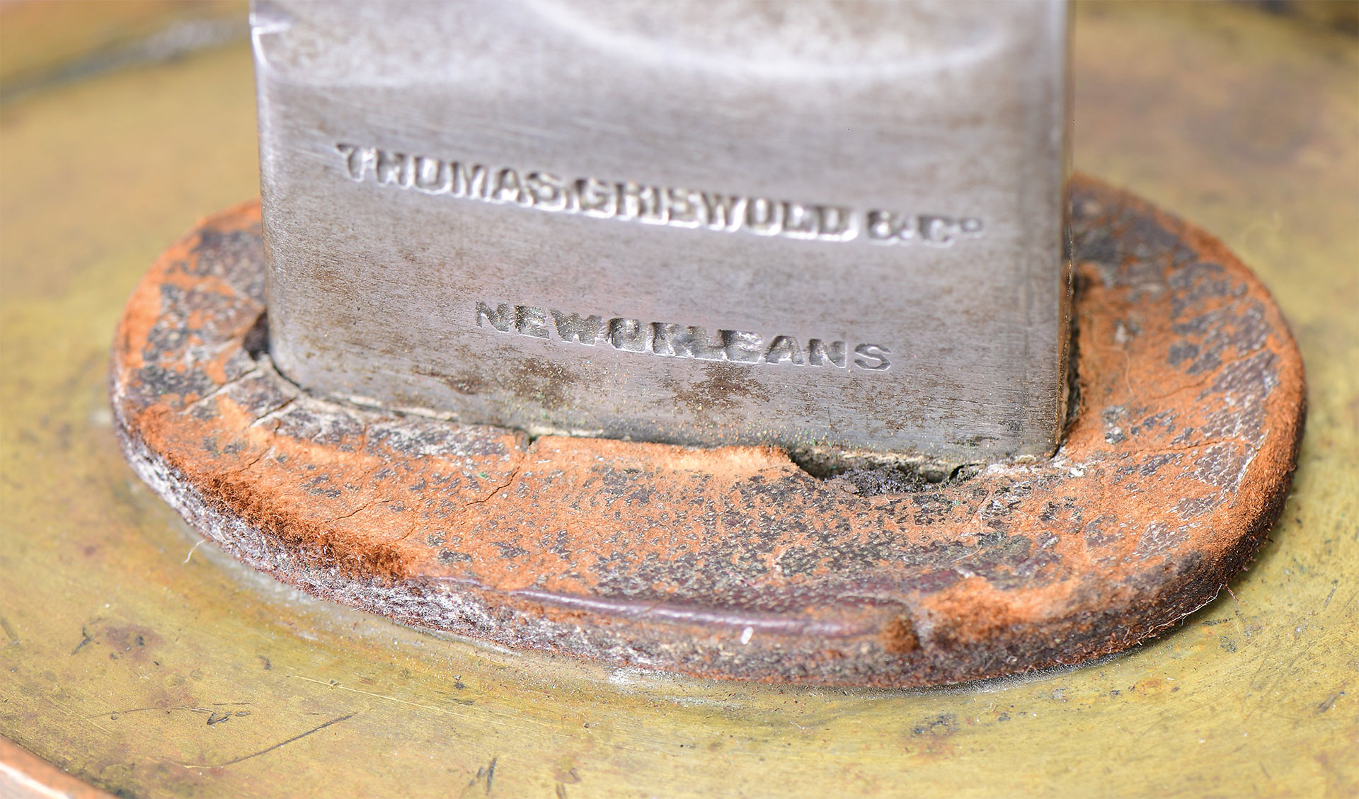Thomas, Griswold & Company made the finest quality swords in the Confederacy. The address stamped on ricasso is rarely seen in two straight lines: “THOMAS GRISWOLD & CO., NEW ORLEANS”. This cavalry officer’s saber as many of their products, had their signature solid brass scabbard. These swords were so popular in their day that several Confederate Generals carried them and even one Union General was known to have carried one that he must have captured at some campaign during the war. It would be difficult to upgrade this fine example especially with rare full firm straight line address.