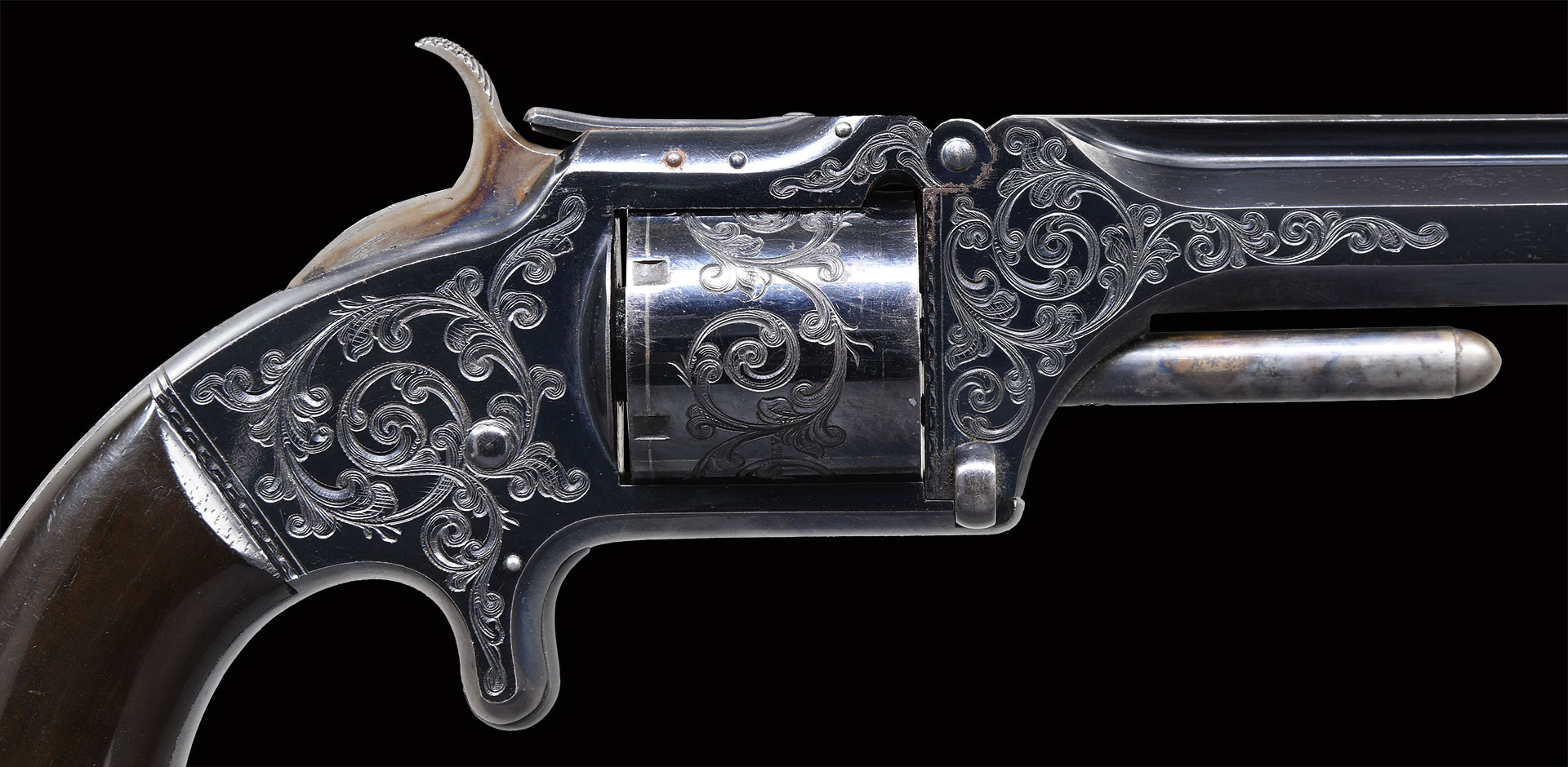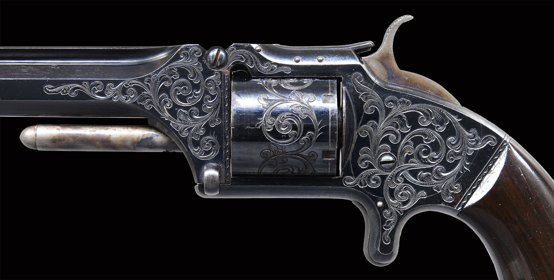 Bbl. 6″ octagon with integral rib having brass blade half moon sight; notch in top mounted cylinder stop serves as the rear sight. Mfg. 1861-1874 (77,155 units) with unfluted 6 rd. cylinder having patent dates around its circumference at the midpoint. Referred to as No. 2 Old Army, yet none were for military contract. History notes one owned by President Hayes, Wild Bill Hickock (on his person when he died) and 2 by Gen. George Custer; very popular during the Civil War. Matching numbered Rosewood grips plus “GG8” on cylinder, barrel and lower left side of back strap under grips. Later production model as evidenced by 3 pins in top strap. Although engraving is not signed (Nimschke only signed 15% of handguns that he engraved), it is certainly of the Nimschke “New York” style having foliate scrollwork with rounded terminals. Louis D. Nimschke (1832-1904) trained in Germany under masters Ernst Moritz and Gustav Ernst before coming to America in 1853 where he began his prolific career in New York City. It is referenced that he engraved about 5,000 firearms and other pieces from 1850 to 1900 (about 2 per week!). His work is even recognized by the Smithsonian Institute. He created many “pulls” from his engravings as well as from other engravers which are compiled in a work book given to the Metropolitan Museum of Art on its 150th Anniversary (2018) by the Robert M. Lee Foundation.