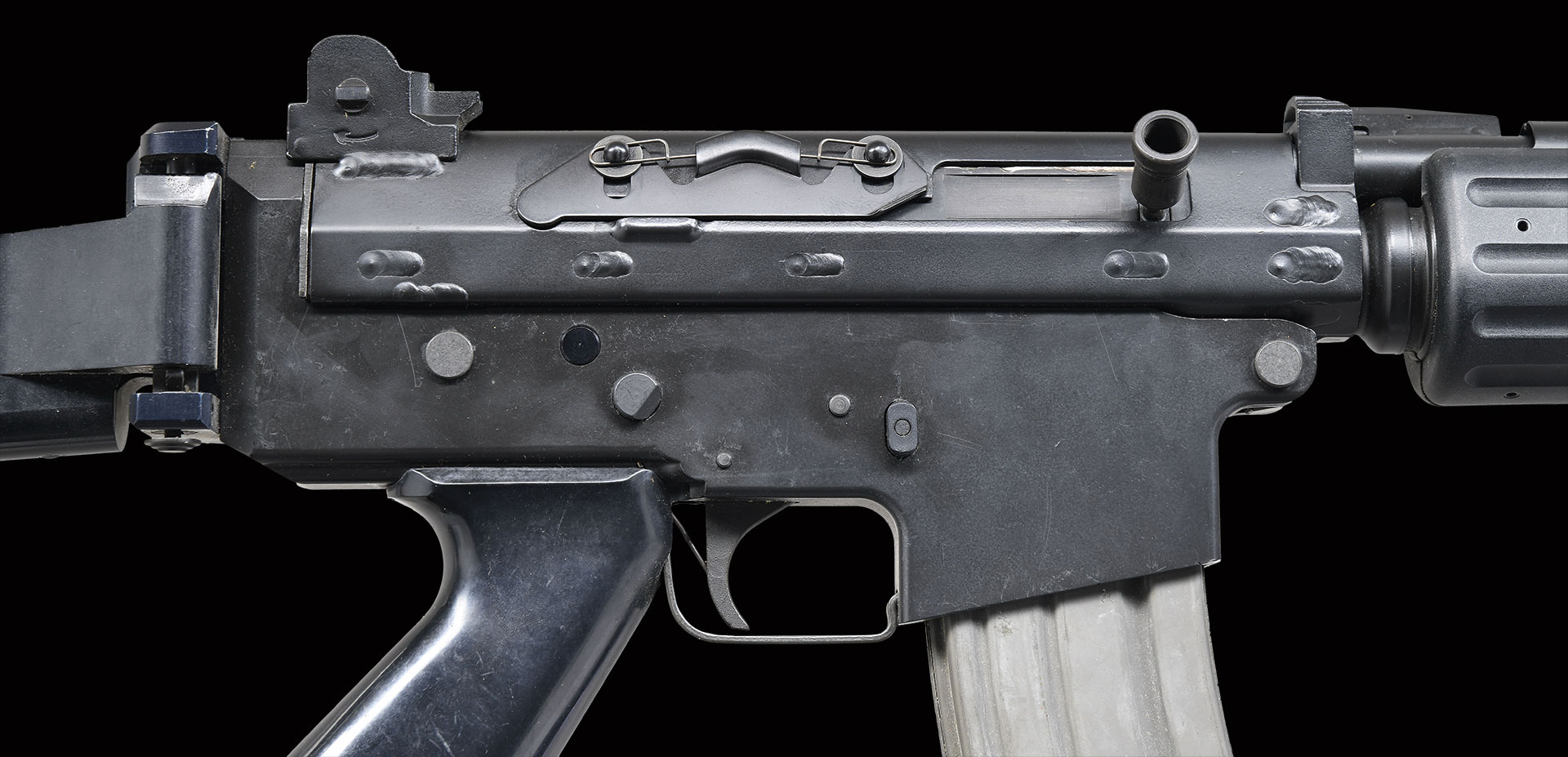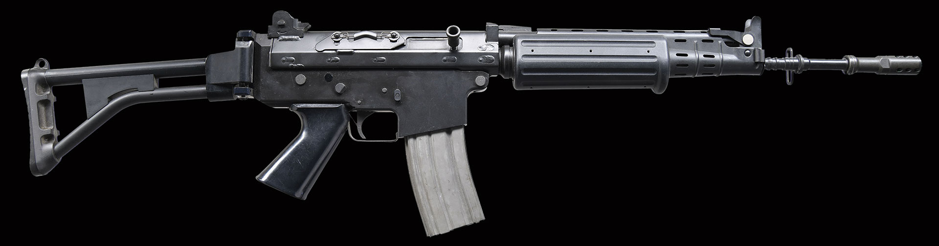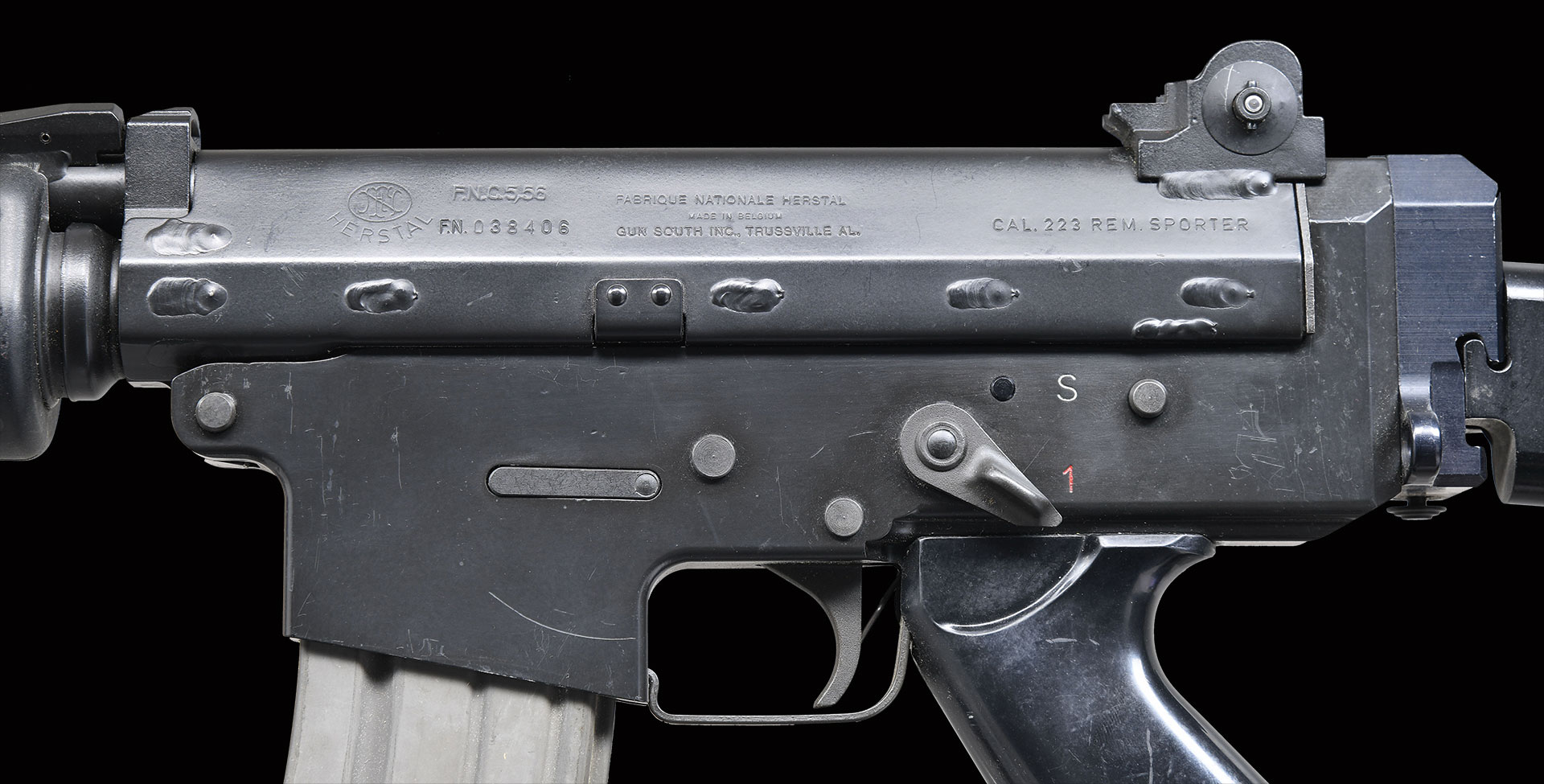 Bbl. 16.5″. A very clean original Belgium manufactured Fabrique Nationale rifle. The FNC, a scaled down & refined variant of the famous FN FAL was imported into the United States until 1987 and remains a rare & desirable rifle to this day. It utilizes a 2 position gas system w/ an integral grenade launcher front sight which functions as a gas shutoff valve when deployed. The gas system is adjusted to send more pressure rearward if the gun should become fouled by rotating the gas tube 90 degrees clockwise. This particular piece was imported by Gun South Inc, from Trussville, AL. The left side safety / selector is marked “S” (safe) / “1” (semi). Matte black finish on all exterior surfaces. Protected post front sight w/ dual aperture rear sight. Right side folding shoulder stock. Ingenious spring loaded dust cover on right side remains under constant pressure, momentarily lifting during the firing cycle, to immediately be closed again upon firing. Utilizes standard AR-15 magazines. Left side of receiver marked w/ serial number, FN Logo & “FABRIQUE NATIONALE HERSTAL / FNC 5.56 MADE IN BELGIUM / GUN SOUTH, INC. TRUSSVILLE, AL. / CAL. 223 REM SPORTER”. MAGS: 1 steel 30 rd.