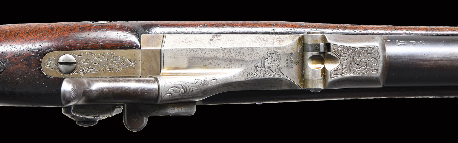 Bbl. 26′ round. Combination front, model 1887 rear w/ Vernier peep tang sight. Case colored high arch 1873 dated breech block. Springfield 1873 lock. Lock, breech block, receiver, trigger guard bow & peak of carbine buttplate have foliate scroll hand engraving. Half length straight grip walnut stock. Features include hand checkering & engraved pewter nose cap w/ fancy finial. Hardwood ramrod w/ nickel finished brass tip is held by a single faceted iron pipe. Estimated quantity of 125 first type rifles were mfg. 1875-1877.