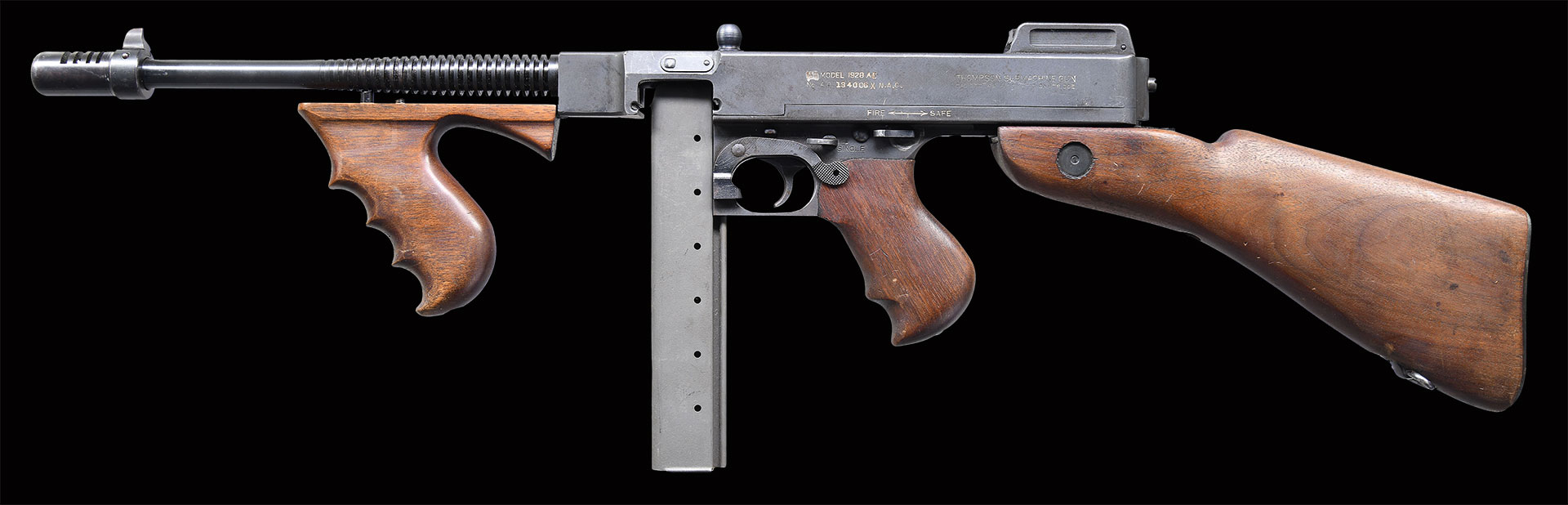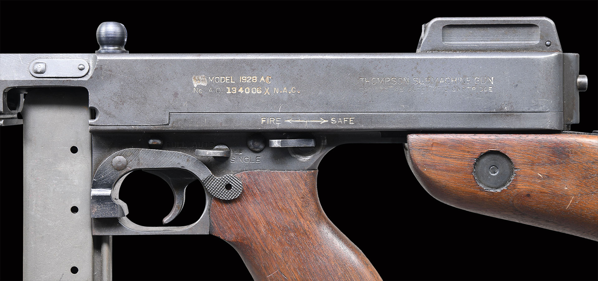 Bbl. 11″. Classic Thompson SMG, US Model 1928 AC overstamp, manufactured by Auto-Ordnance Corporation, in Bridgeport, CT. 24 rib finned bbl. Terminated w/ unmarked Cutts compensator. Horizontal wood fore arm. Front blade sight integral w/ compensator & rear is adj. Lyman graduated sight. Hardwood, rear shoulder stock w/ trapdoor buttplate. Sling swivel at 6-O’clock below shoulder stock. Slotted top mounted cocking knob. Parkerized finish on exposed metal surfaces. Left side receiver markings are as follows: “U.S. Model of 1928 A1”, w/ the “1” over-stamped “C”. The “U.S.” marking, before the model designation has been ground off as is typical. “Thompson Submachine Gun / Calibre 45 Automatic Cartridge”. Serial number line, below the model line includes the correct “AO” prefix w/ correct “X N.A.C.” suffix Right side markings include patent block on rear of receiver & “Auto-Ordnance Corporation”, “Bridgeport Connecticut, U.S.A.”. Trigger frame serial number matches receiver number. MAGS: 9 parkerized 30 rd., 2 blued 50 rd. Type L drums.