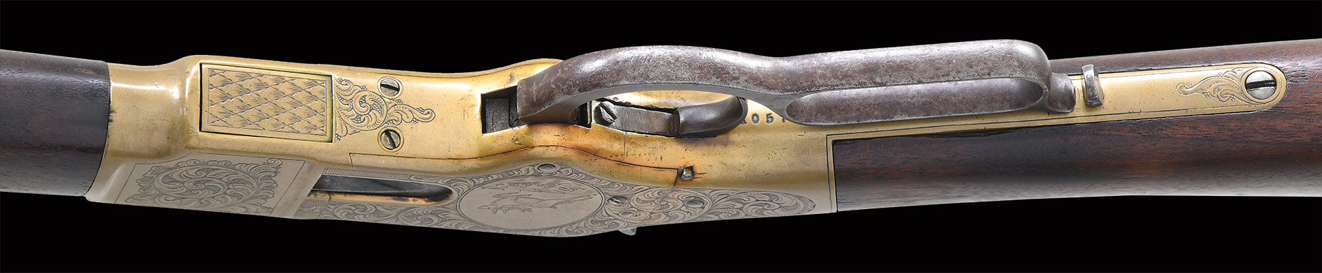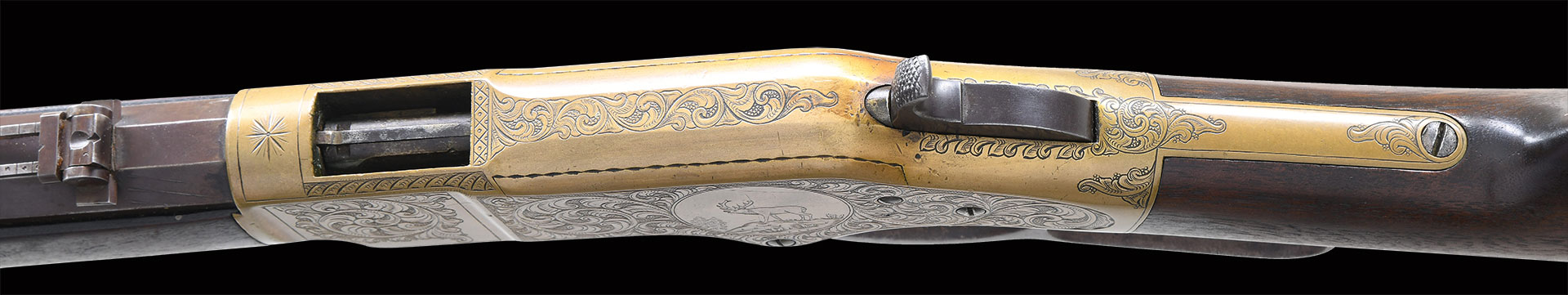Bbl. 24″ octagon w/ rocky mountain front sight w/ folding leaf rear sight. Walnut forearm & straight grip stock w/ brass crescent buttplate & sling swivels. This fine rifle features generous coverage of unsigned period engraving indicative of Louis D. Nimschke’s work. Circular scene on right sideplate features a running bull elk. Left sideplate features a scene w/ a bugling bull elk. Balance of the receiver sides are covered w/ vine type foliate scroll w/ punch dot backgrounds & single line borders. Complimenting scroll extends to upper & lower receiver areas w/ an eight point star on the front receiver ring. Bottom of lifter has diamond shaped designs w/ grass highlights. Brass forearm cap has four pointed floral scroll. Peak of buttplate has fancy borders w/ scroll highlight. Walnut forearm & straight grip stock w/ sling swivels. S# indicates 1872 mfg.