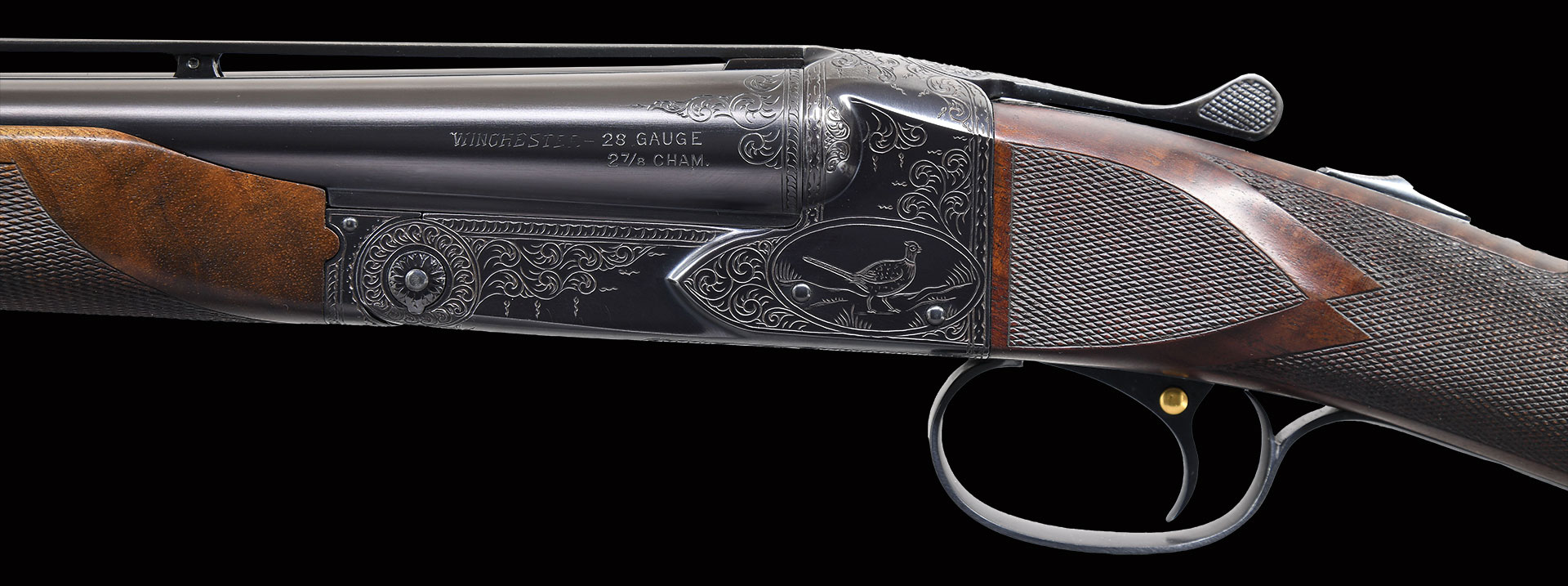 CURRENT SPECIFICATIONS: Bbls: (1). original set, 20 ga. 2 3/4″. 28″ vent rib. Fixed WS-1 & WS-1 chokes. (2). original 2nd set, 28 ga. 2 7/8″. 26″ vent rib. Fixed Skeet & Skeet chokes. Original M21 28 ga. vent rib guns are very rare.(3). Added by Winchester during the 1980/81 upgrade. 20 ga. 3″. 28″ vent rib Fixed Mod & full chokes. (4). Purchased from Galazan’s in 1995. 410 3″. 28″ vent rib. Fixed Imp-Mod & Full chokes. All bbls. have steel front & mid beads & individual forearms. Bbl. flats,lugs, ejectors & inside of forearms are machine-jeweled. Blue finished boxlock action features No.5 factory engraving added during the 1980/81 upgrade by factory engraver Pauline Murrell. Pauline was the last of 8 Winchester in house engravers and is the one still living. Engraving features vignette of a grouse on the right side, pheasant on left, a setter retrieving a bird on the floorplate & pointing dog on the trigger guard bow. Scenes are surrounded by scroll engraving & fancy borders that continue to upper & lower receiver areas, breech end of bbls. & forearm iron. Floorplate is marked “deluxe/skeet”. Breech face and water table are machine-jeweled. Single selective trigger w/ gold finished selector button. Selective ejectors. Non-automatic safety. Straight grip stock & beavertail forearms for the first three barrels were custom built by Winchester during the 1980/81 upgrade. Stocks are of the finest quality black walnut with point pattern borderless hand checkering and boiled Linseed oil finish. All forearms have ebony tips. LOP: 13 7/8″ over a solid red Winchester pad. DAC: 1 1/2″. DAH: 2″. Downward Pitch: 1 1/2″. WEIGHT w/ 28 gauge bbls: 7 lbs, 13.4 oz.