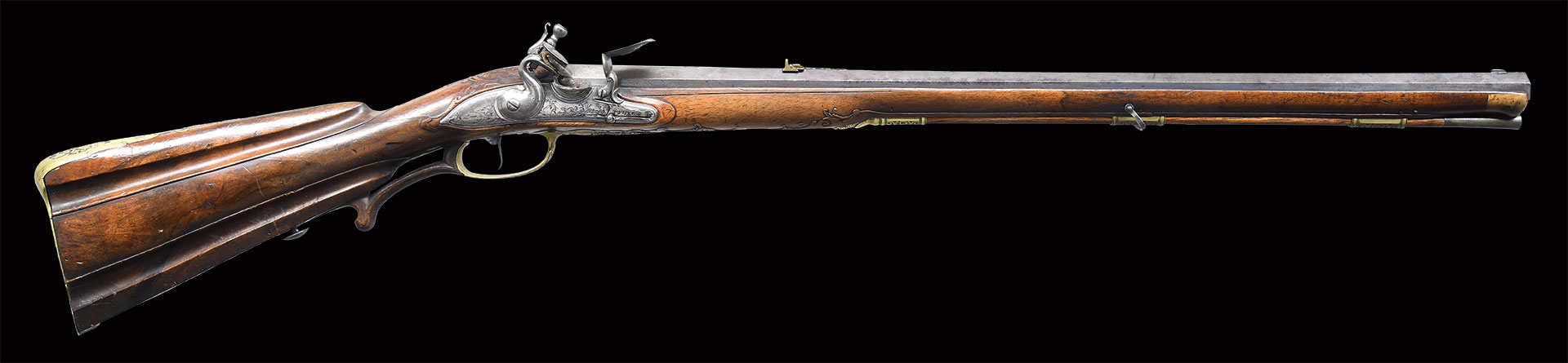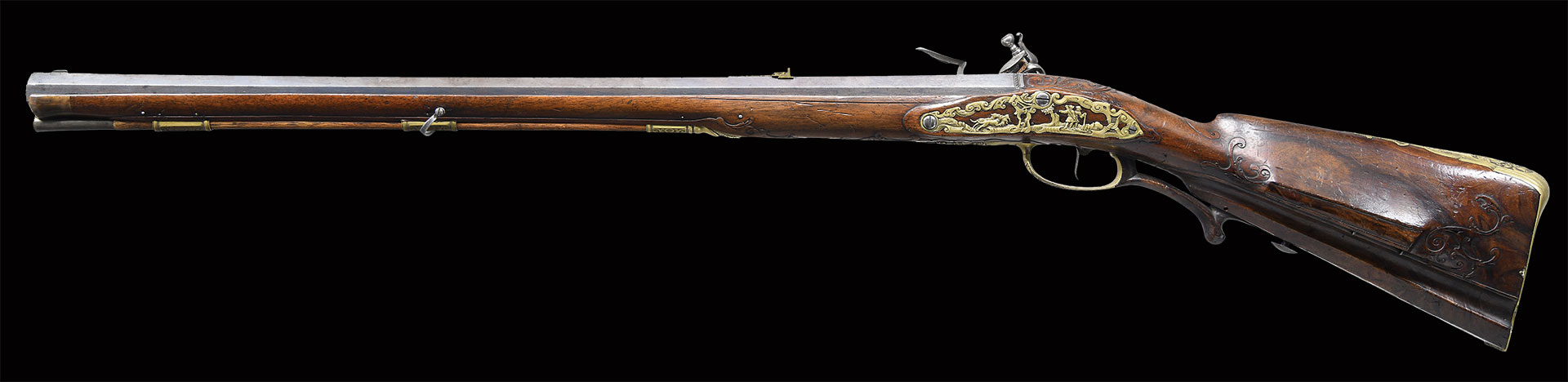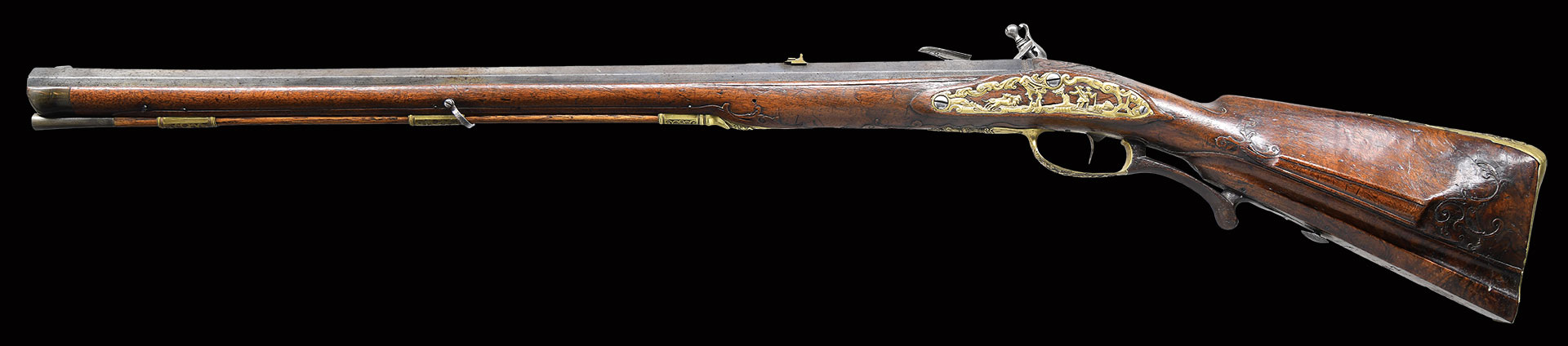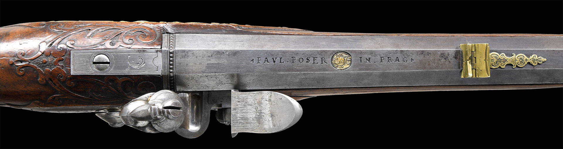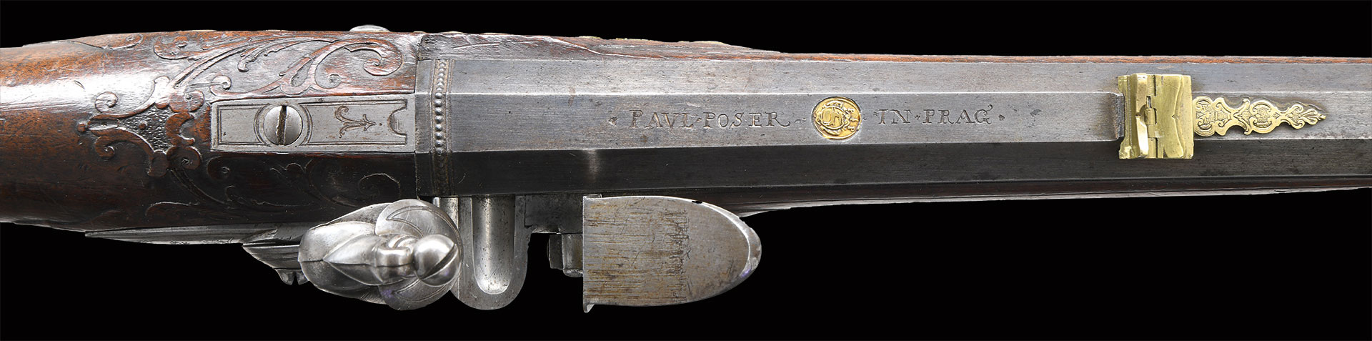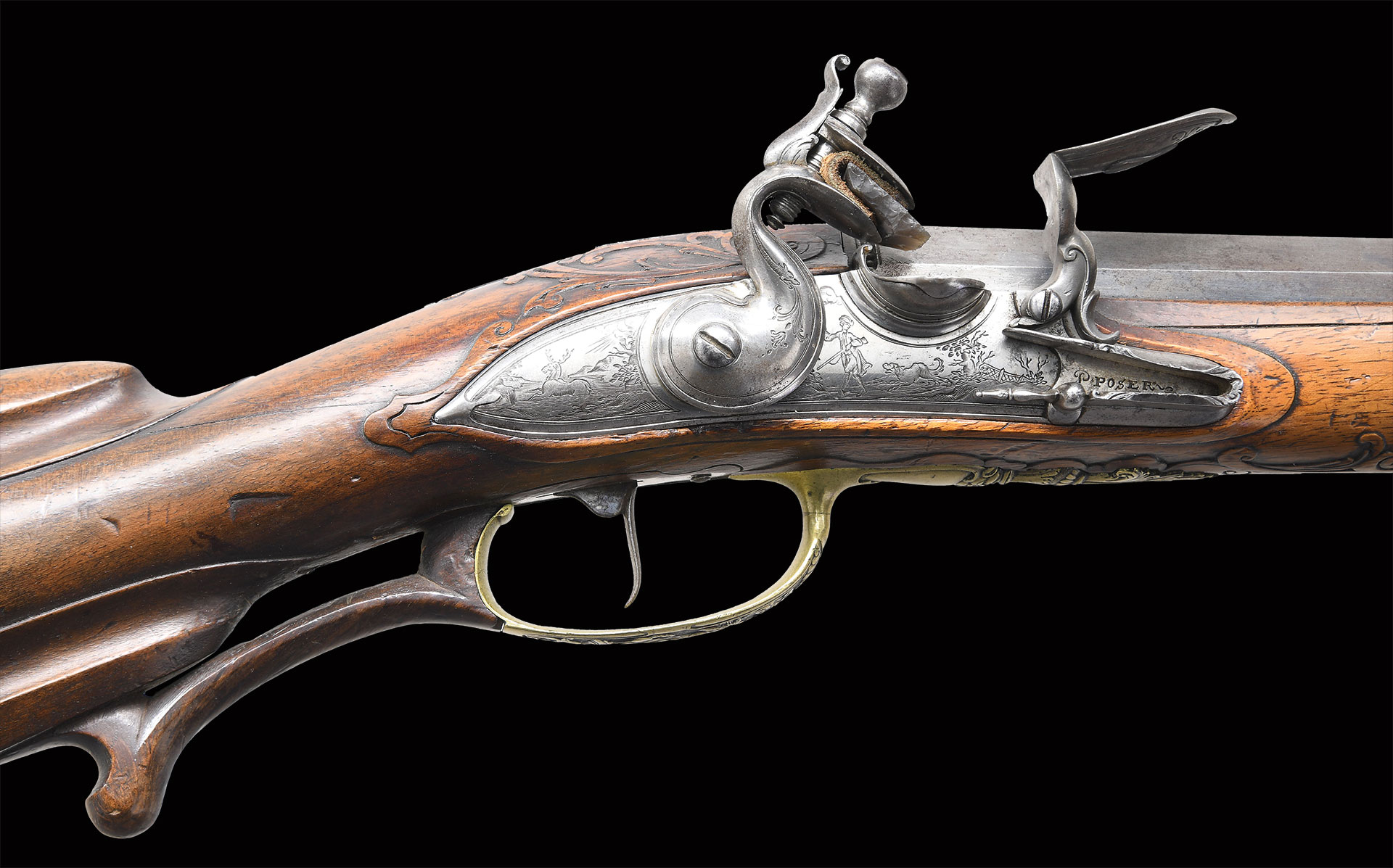 Paul Poser (1646-1730) ranked among the best craftsman working in the famed Bohemian area of iron production and gun making. Many surviving examples of his work are found in the finest arms collections throughout the world. His works include wheellock guns and rifles from the 1680’s to early 1700’s, as well as early flintlocks like this stunning pair. These rifles have 26-1/2″ deeply swamped octagon barrels with dramatic flares at muzzles. Barrels are mounted with “V” notch bronze rear sights with two folding leaves and silver front beads. Top flats are engraved “Pavl. POSER (Gold poincon as shown on page 976 of Heer) IN. PRAG.”. Barrel tangs are engraved with the numbers “1” & “2”. Flint locks with rounded and slightly arched plates feature inset rounded pans, unbridled friction frizzens and feather springs with long filed spear finials. Serpentine cocks are also round bodied. Cocks and frizzens are neatly chased with some raised decoration. Feather springs are also decoratively filed. Locks are engraved with hunting scenes showing jaegers carrying guns being followed by dogs in front of cocks; stags run away on lockplate tails. The area framed by the feather springs is engraved “P. POSER”. Stocks made of lightly marbled and figured European walnut extend to muzzles with horn caps and are pinned to barrels. Butts are deeply fluted reminicent of wheelock styling and moulded cheekpieces are on left sides. Areas behind barrel tangs as well as either side of cheekpieces are relief carved with open scrolls. Slightly raised mouldings surround locks and most furniture and extend along ramrod channels. Bronze ormolu furniture consisting of buttplates with large, long top tangs, pierced sideplates and trigger guards with foliate finials have engraved border mouldings and other incised work. This decoration frames superbly rendered relief chased carvings consisting of swags, ribbons and foliage surrounding grotesque faces on tops of buttplates. Full bodied statues of Diana goddess of the hunt, with her crescent coronet and hound at her side, are on trigger guard bows. Wonderful pierced sideplates are decorated with a border of relief carved scrolls outlining scenes of hunters at right and hounds retrieving a hare at left. Relief scroll is on octagonal ramrod pipes and grotesque faces are on thimbles. Original hickory ramrods with horn tips, sling loops and buttons are still in place. A rack or collection number “N3” is on each toeline.