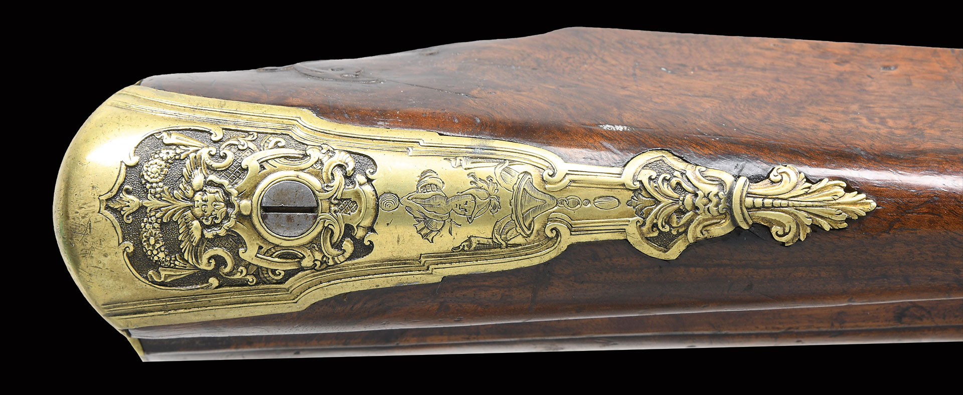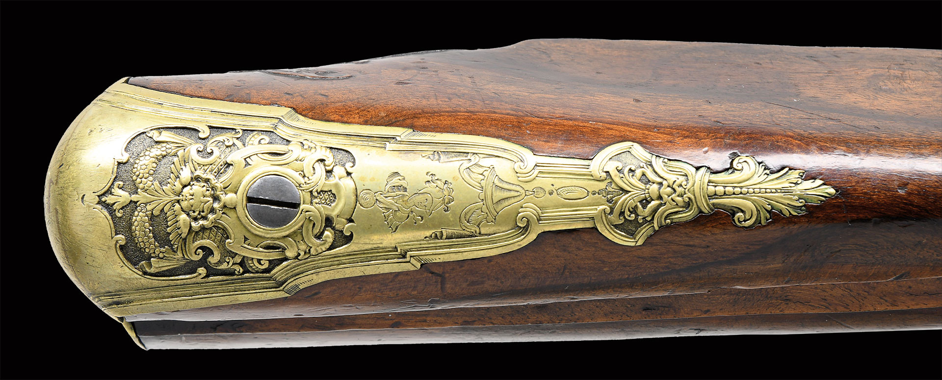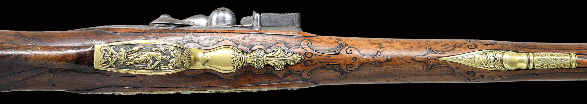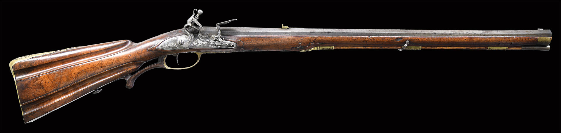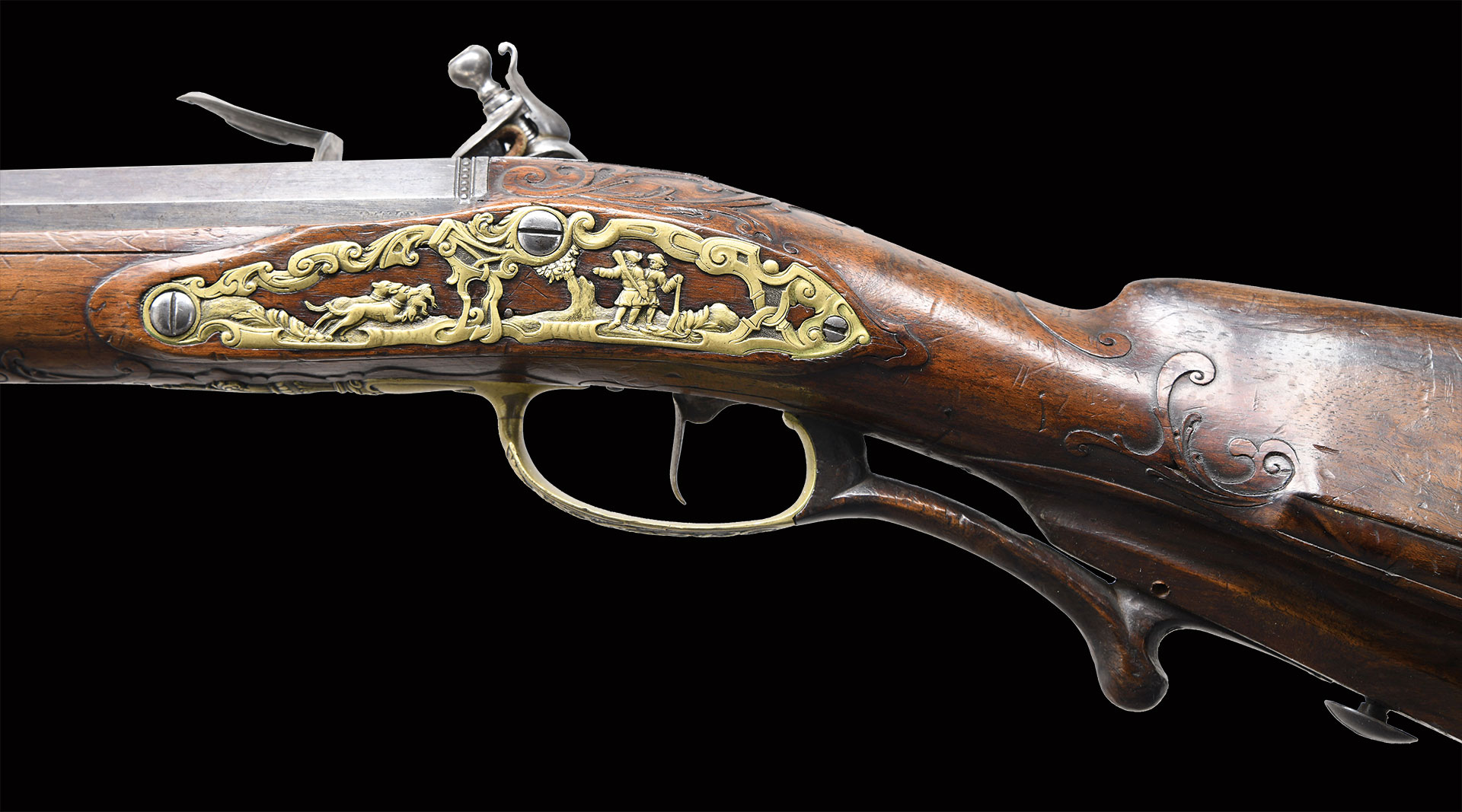 Paul Poser (1646-1730) ranked among the best craftsman working in the famed Bohemian area of iron production and gun making. Many surviving examples of his work are found in the finest arms collections throughout the world. His works include wheellock guns and rifles from the 1680’s to early 1700’s, as well as early flintlocks like this stunning pair. These rifles have 26-1/2″ deeply swamped octagon barrels with dramatic flares at muzzles. Barrels are mounted with “V” notch bronze rear sights with two folding leaves and silver front beads. Top flats are engraved “Pavl. POSER (Gold poincon as shown on page 976 of Heer) IN. PRAG.”. Barrel tangs are engraved with the numbers “1” & “2”. Flint locks with rounded and slightly arched plates feature inset rounded pans, unbridled friction frizzens and feather springs with long filed spear finials. Serpentine cocks are also round bodied. Cocks and frizzens are neatly chased with some raised decoration. Feather springs are also decoratively filed. Locks are engraved with hunting scenes showing jaegers carrying guns being followed by dogs in front of cocks; stags run away on lockplate tails. The area framed by the feather springs is engraved “P. POSER”. Stocks made of lightly marbled and figured European walnut extend to muzzles with horn caps and are pinned to barrels. Butts are deeply fluted reminicent of wheelock styling and moulded cheekpieces are on left sides. Areas behind barrel tangs as well as either side of cheekpieces are relief carved with open scrolls. Slightly raised mouldings surround locks and most furniture and extend along ramrod channels. Bronze ormolu furniture consisting of buttplates with large, long top tangs, pierced sideplates and trigger guards with foliate finials have engraved border mouldings and other incised work. This decoration frames superbly rendered relief chased carvings consisting of swags, ribbons and foliage surrounding grotesque faces on tops of buttplates. Full bodied statues of Diana goddess of the hunt, with her crescent coronet and hound at her side, are on trigger guard bows. Wonderful pierced sideplates are decorated with a border of relief carved scrolls outlining scenes of hunters at right and hounds retrieving a hare at left. Relief scroll is on octagonal ramrod pipes and grotesque faces are on thimbles. Original hickory ramrods with horn tips, sling loops and buttons are still in place. A rack or collection number “N3” is on each toeline.
