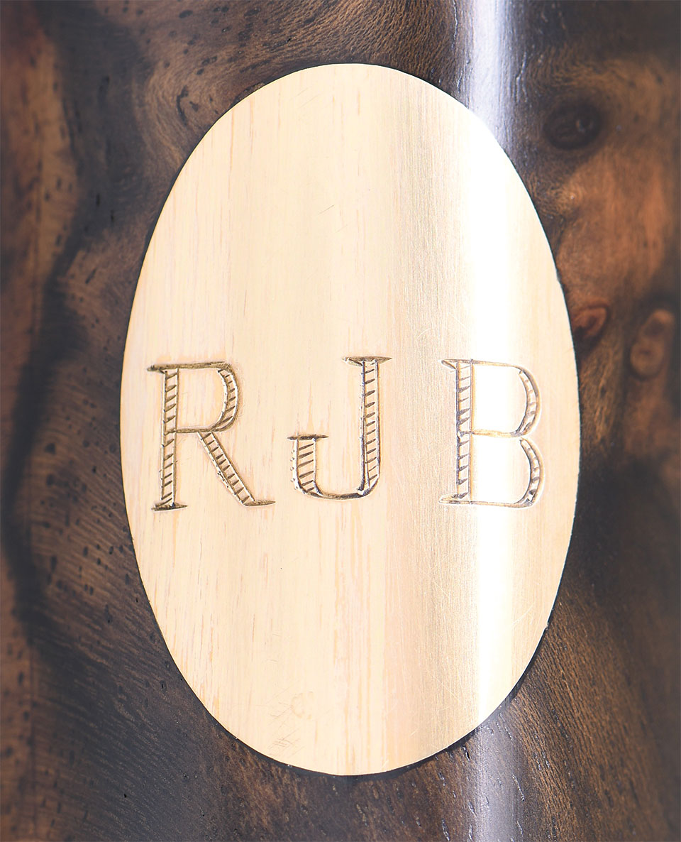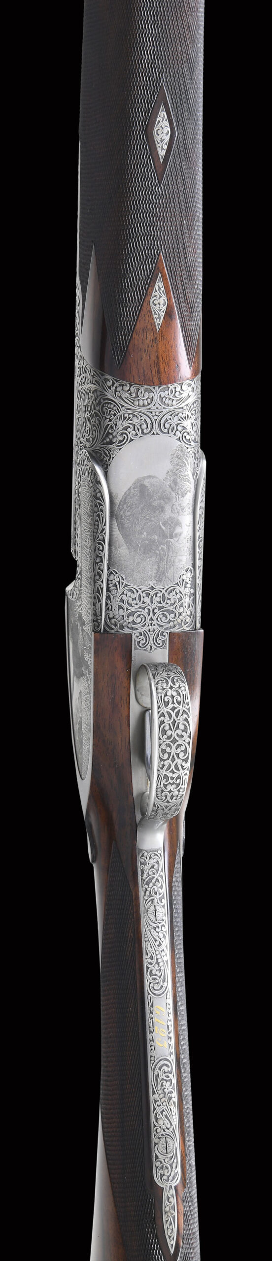 The 30″ demi-block barrels are fitted with flat matted solid rib. Left side of top barrel is marked “A. GALAZAN” and right side is marked with Connecticut Shotgun name and address. Barrel flat is marked with S# and caliber information. Coin finished completely pinless low profile Boss style O/U action is fitted with non-automatic safety (“SAFE” inlaid in gold) and single non-selective trigger. Action is engraved with full coverage truly exceptional large open scroll with beaded highlights which is beautifully shaded. On bottom of action is an intricately detailed Bulino scene of wild hog or Russian boar standing in open field with sprigs of grass in foreground and dramatic woods behind. Lockplates are completely engraved with Bulino scenes of a black lab. On left lockplate he is retrieving a mallard from a cattail swamp. On right side he is retrieving a ring neck pheasant from a cut-over corn field. Top lever pivot is engraved with a portrait of this dog and a mallards head is exposed when the gun is opened. Backgrounds are also amazingly detailed. This fine work is by the well known father and son team Giancarlo & Stefano Pedretti whose signature appears on trigger plate and lower left of duck scene. The fine relief scroll continues on to single beaded trigger guard bow and tang which has S# inlaid in gold. Straight grip buttstock is made of a fine piece of stump figured and well marbled European walnut and measures 14-5/8″ over checkered wood butt with engraved steel heel and toe plates. Stock features drop points, well cut borderless point pattern checkering at grip and a gold oval on toeline engraved “RJB”. Matching full one piece ejector forend with Anson type release has iron shaped in classic Boss style which is engraved to match action.