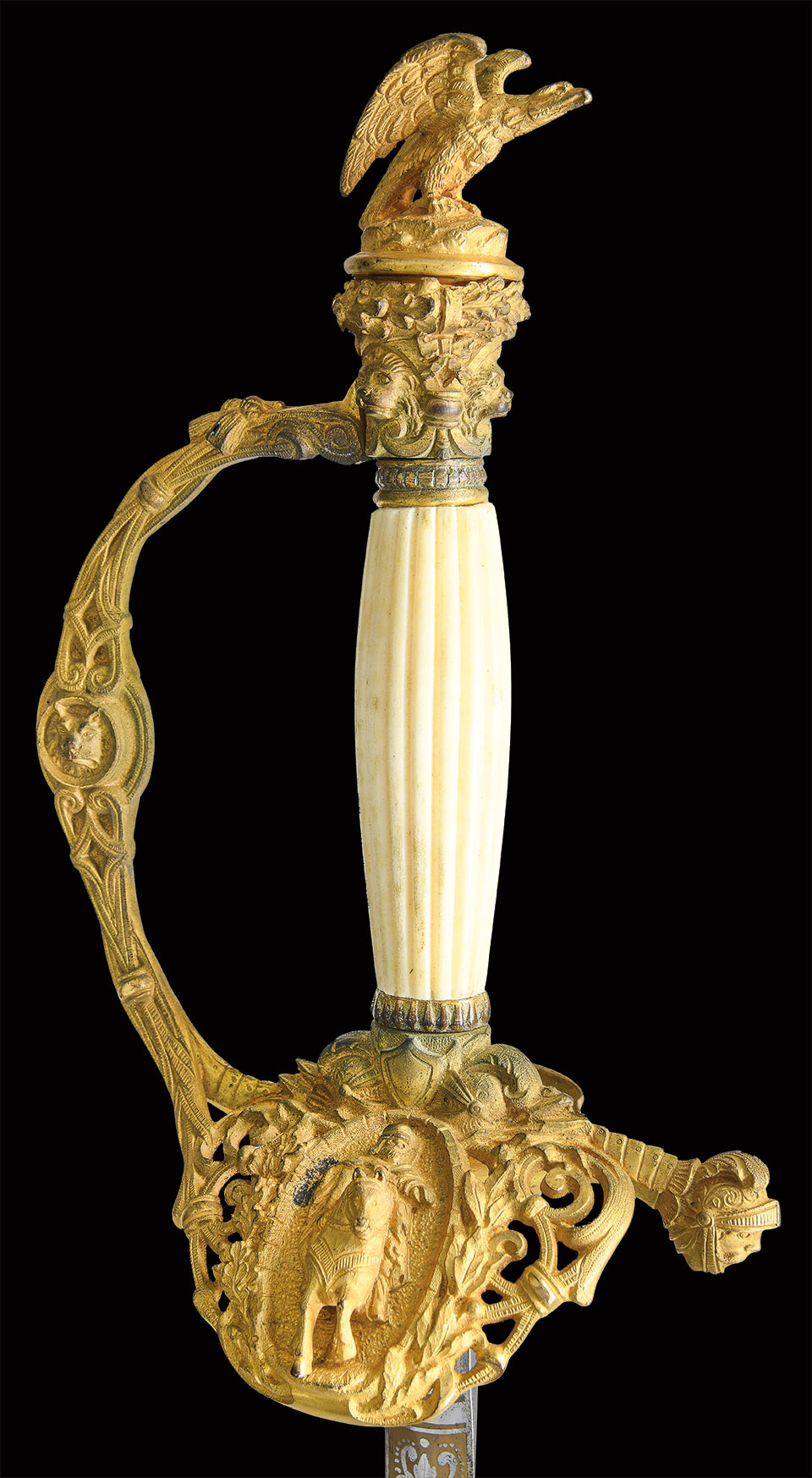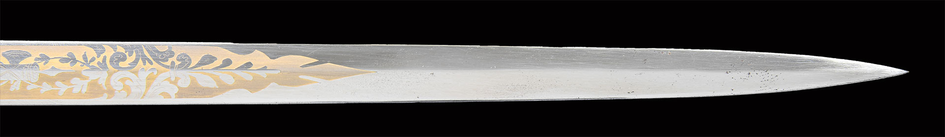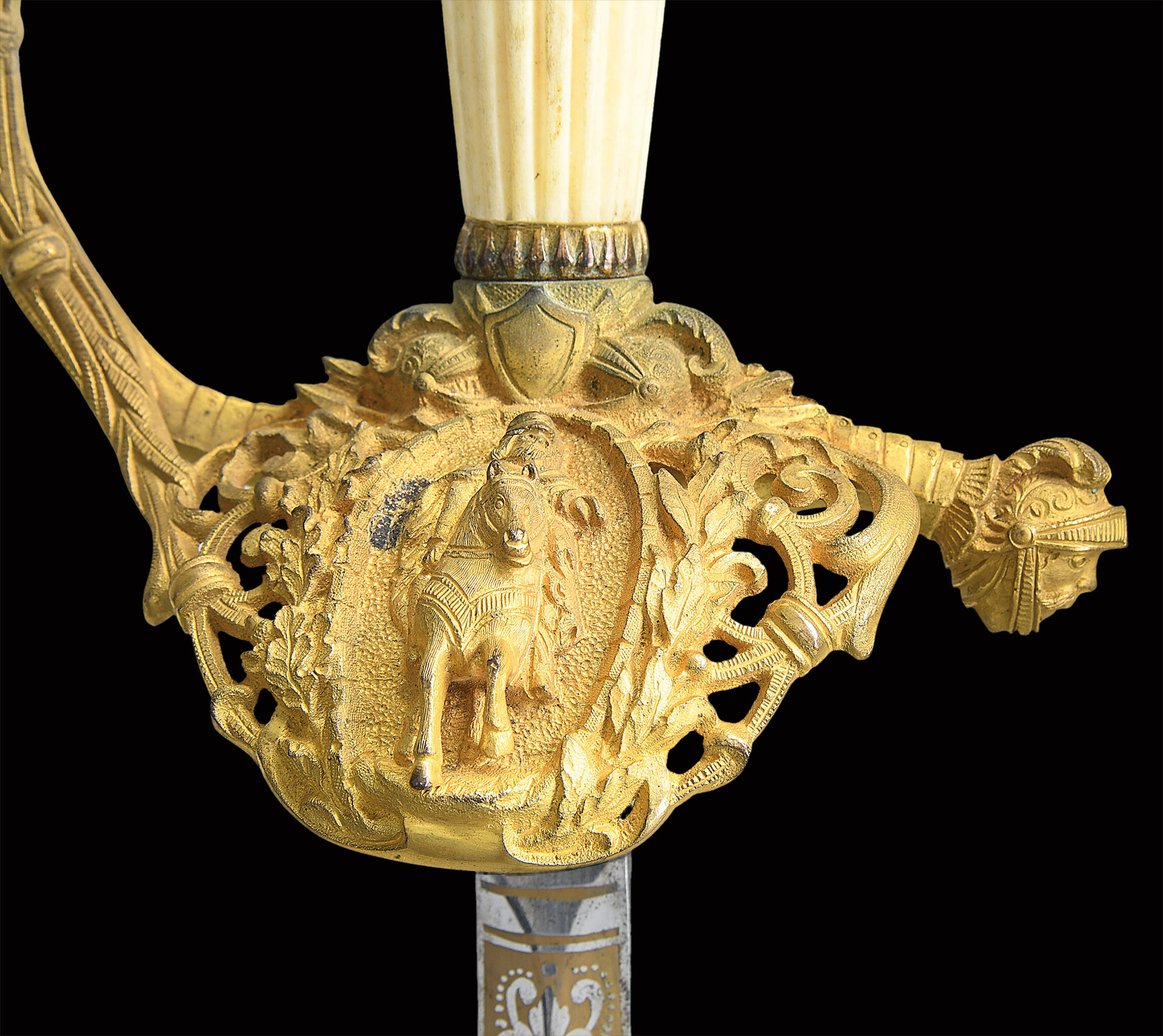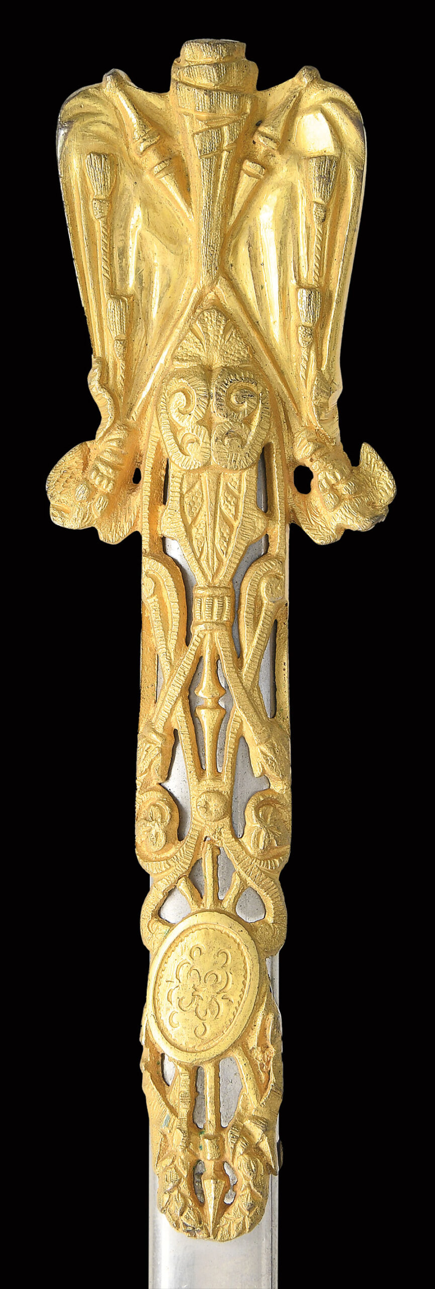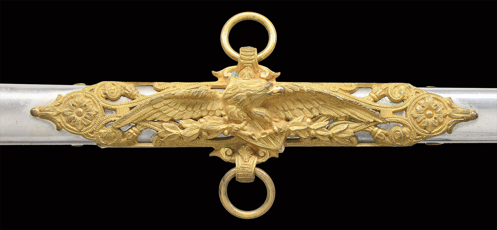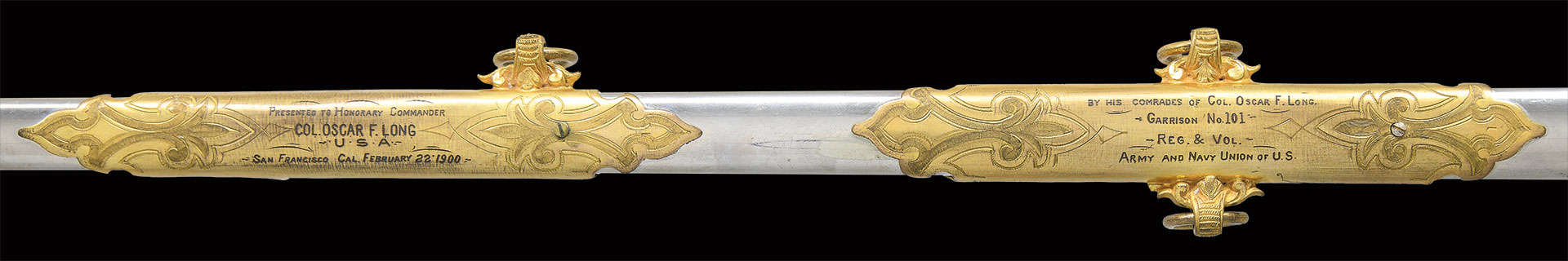 Oscar Fitzalan Long (1852-1928) was awarded the Congressional Medal of Honor for valor in action during the Indian Wars in 1877. He had just graduated from West Point in 1876 and spent his long military career in the west. This beautiful presentation sword cased sword was made by Benoit Pasquale & Sons of San Francisco & was presented in 1900. Pasquale was the only premier sword and regalia maker on the Pacific coast, started business in 1854 and many of his swords dating from the Civil War have his trademark extreme 3-dimentional figural relief designs. This high grade model 1860 staff and field officer sword has pierced & chased detail, A mounted knight appears to be riding straight of guard in full relief, a full figure helmeted knight’s head terminates quillon, a full figure American eagle perches on top of pommel, a full figure knight and full figure spread wing American eagle decorate top scabbard mounts in high relief. 31” double edged blade is fully etched with patriotic panels and gold highlights, signed “B. PASQUALE & SONS, SAN FRANCISCO, CAL” on ricasso. The two upper scabbard mounts have presentation on reverse. The sword casing is brass bound of beautiful grain oak, plaque on lid has intricate monogram of Long’s initials.