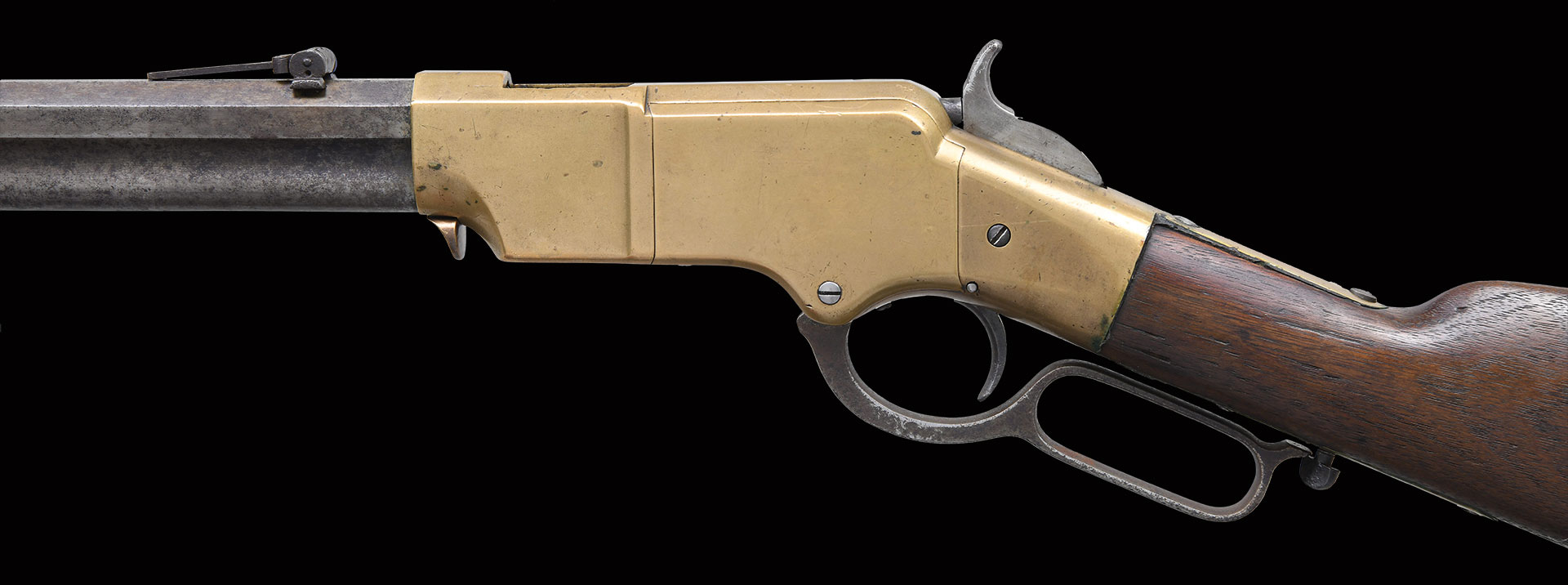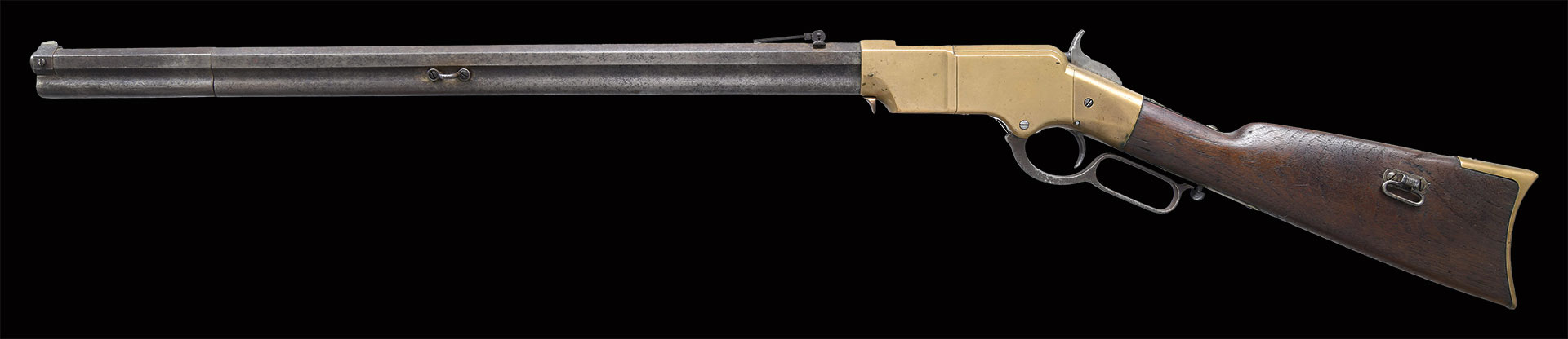 This honest survivor was made in 1864 and has all the characteristics proper for this 5th variant. Matching serial numbers are found on 24 3/8″ octagon barrel, stock, and 2nd type pointed buttplate. Screws are properly unnumbered. The rear sight is the last transition graduated to 900 yards with added slide retaining screw. Sling swivels are mounted on the left side of stock and barrel. More Henrys were made in 1864 than any other year, estimated production at about 4000 with many being sold privately for use in the Civil War.