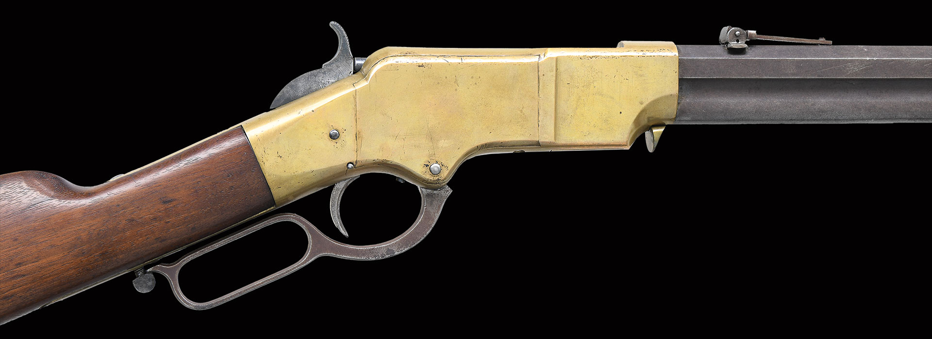 This rarely seen 6th variation Henry rifle was the result of the factory cleaning up the remaining Henry barrels and receivers and making up a few final rifles for sale to the public. Serial numbers of documented Henrys with round top frames like the 1866 Winchesters being made in same serial range run approximately 14183-14362, with 17 survivors in database. This model is identical to the late 5th model with the exception that the top portion of the receiver in front of the ejection port is machined round and rear of ejection port has rounded bevels instead of 3 flat surfaces as found on all previous Henry rifles. UNATTACHED ACCESSORIES: old dealer tags: “sold Tulsa 4-1-2007, $37,000”.