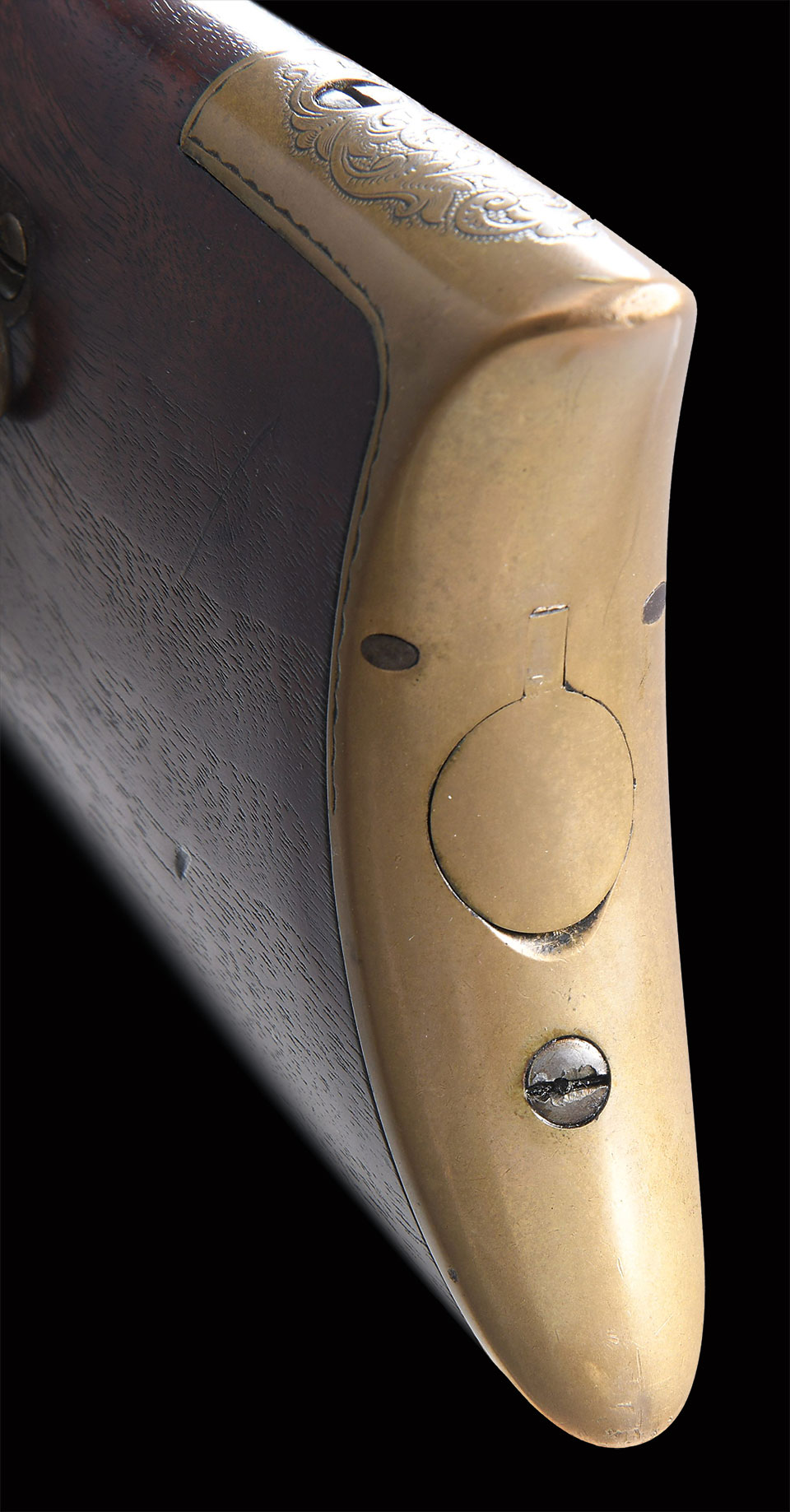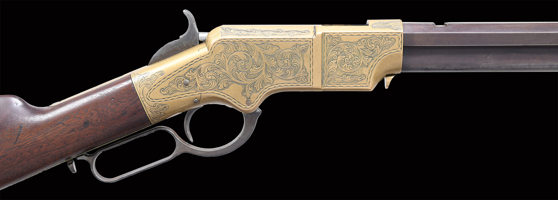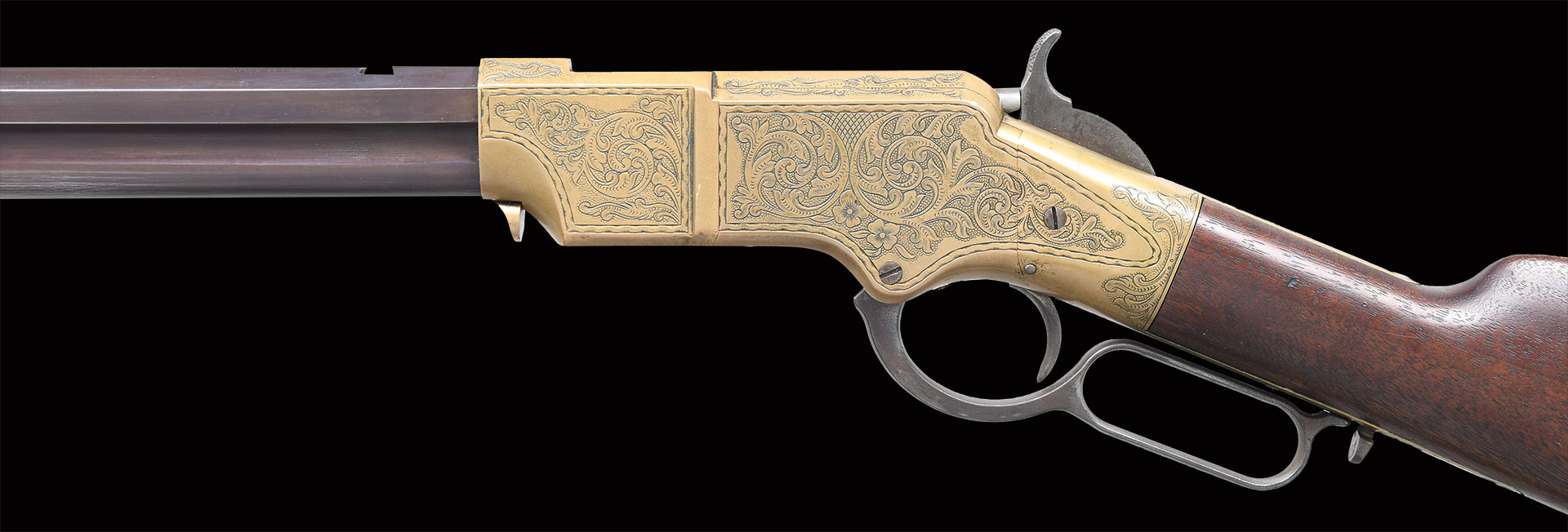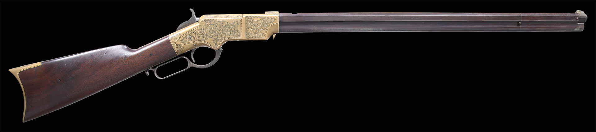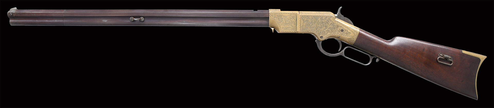 This is a standard late production 5th variation Henry rifle made in 1866. Standard configuration of 5th variation ran approximately serial number 5000-12900. Pointed 2nd type butt plate with 3/4″ trap door, .65″ hole bored in the butt stock to accept iron 4-piece cleaning rod. Large trigger retaining pin .125″ diameter, lever latch on lower receiver tang and latch flange on rear of lever, has a milled flat along the magazine follower slot in lower front of receiver, large magazine follower with 5/8” wide finger tab, square back front sight blade which is trimmed, slanted profile to stock comb, “Henry bump” not discerned, but stock appears lightly refinished, large 3.25″ all serif barrel address, sight dovetail milled in barrel only, five groove rifling only noted on late guns, should have had 900 yard rear sight with slide stop screw but is missing, sling swivels on left side. Serial number stamped on following parts: barrel behind rear sight dovetail (re-engraved on this gun), left side of lower receiver tang, top receiver tang channel in butt stock, inside bottom edge of butt plate. Matching assembly numbers stamped on rounded portion of barrel under loading sleeve and on rear edge of loading sleeve. Factory Hoggson engraved scroll & floral design typical of all Henry production. In the 11000 serial range there are 18 documented factory engraved guns.