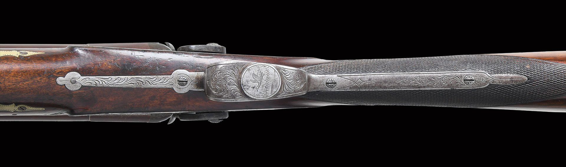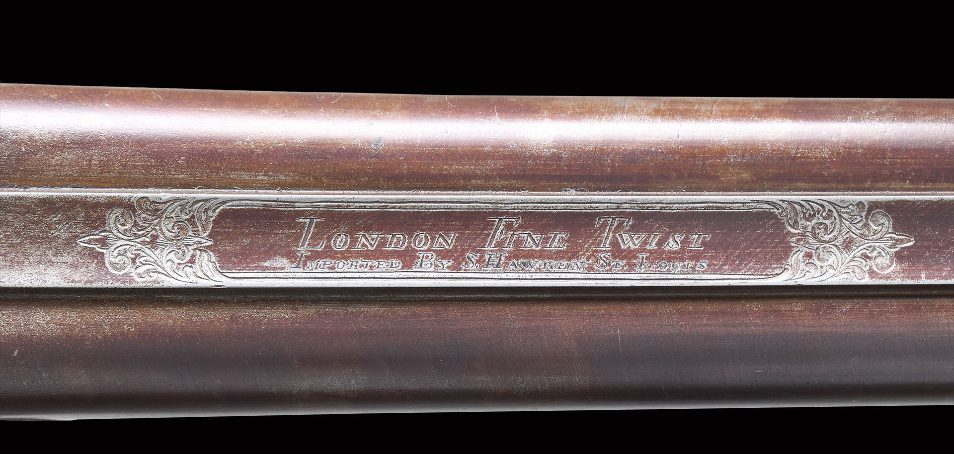 Bbl. 37 3/4″ twist steel with concave game rib. Rib is marked “London Fine Twist/ Imported By S. Hawken St. Louis” in a banner with scroll engraved borders. Breech end of bbl. has double German silver inlaid bands, with raised reinforcements in lower breech area. Brass bead front sight. Underside of bbl. has standard “ELG” Belgian proof marking. Unmarked trade locks have generous scroll engraving that continues to the top tang, buttplate peak, floorplate, and long tang trigger guard. The trigger guard has a raised oval engraved with a marsh scene and flying bird. Straight grip stock of fine European walnut, held by 2 wedges with checkering at the wrist. Stock features include a steel shotgun buttplate, German silver spring loaded circular engraved patchbox with circular iron cover, and a shield escutcheon inlaid in the toe line. Forend has ornate German silver wedge escutcheons with borderline engraving, and fancy finialed German silver thimble. Brass tipped hardwood ramrod, that appears to be replacement, as held by 2 plain iron pipes.