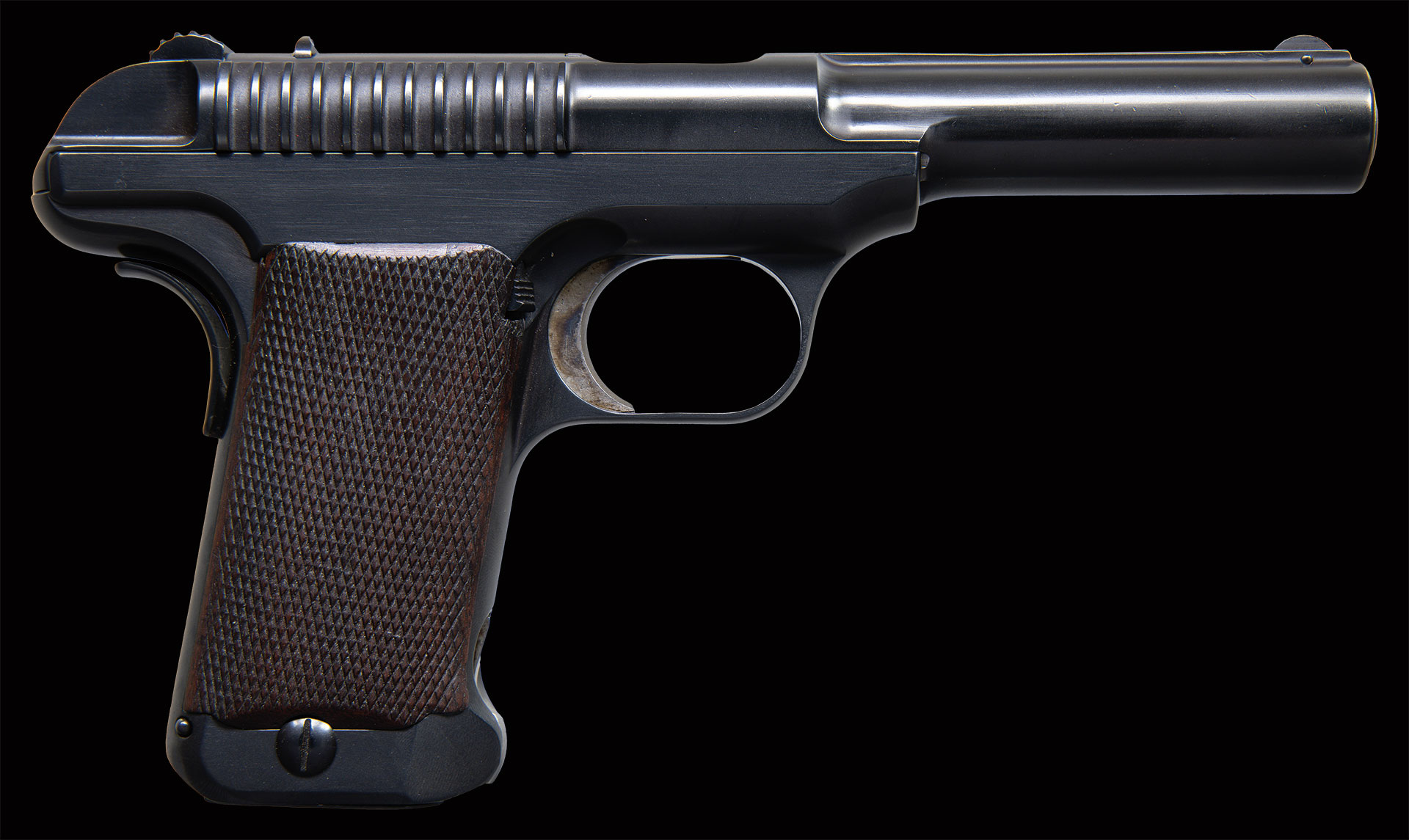 Bbl. 5 3/8″. Standard configuration Savage 1907 pistol in .45 ACP made by Savage to compete against the Colt. Production limited to 288 pistols, this one (#130) is listed by serial number on page 261 in the book: “U.S” Military Automatic Pistols” by Scott Meadows, reported as being in a private collection, having a serial number just beyond the group, issued to Troop I, 3rd Cavalry, Fort Wingate, New Mexico. After testing, the guns were reworked and sold commercially. Part of the refinish included removing most of the slide legend, leaving only “ CAL .45”. The only other marking on the gun are the “SAFE” and “FIRE” at the rear of the frame. In this case, all parts matched to #130 except the grips and the mag. (S# 110). Disassembly shows all matching parts, with many small parts appearing to have been renumbered, the left grip struck with several S#s including 130, the right grip with a faint “5”. MAGS: 1 correct 8-rd. mag.