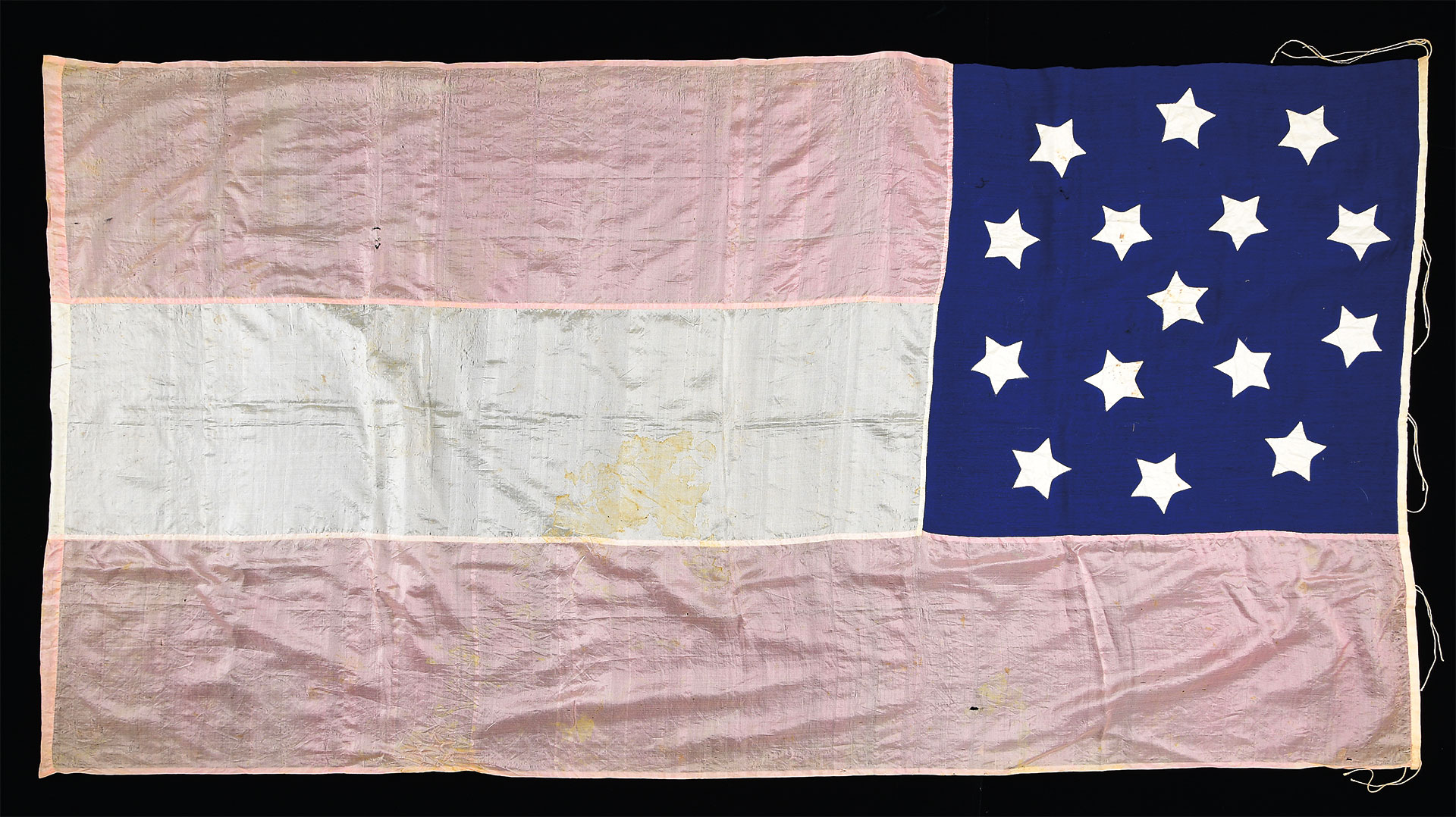 This early flag was made by the “Confederate ladies of Moorefield” Virginia according to an associated tag. This flag had been on loan and displayed at the Hardy County Historical Society, Moorefield, West Virginia for many years till the museum was closed and returned to the family. Flag is all hand sewn and sheer silk field and light lightweight bunting, 21.5″ canton, 15 3″ stars are in unique arrangement of central star, 4 stars in square surrounded by 10 stars in circle, which forms a “Southern Cross”. 15 star Confederate flags are rare and represent all states including ones Union occupied that could not secede but produced Confederate troops. Flag is company sized 63″ on fly and 32.5″ on hoist, still retains all 5 original string ties.