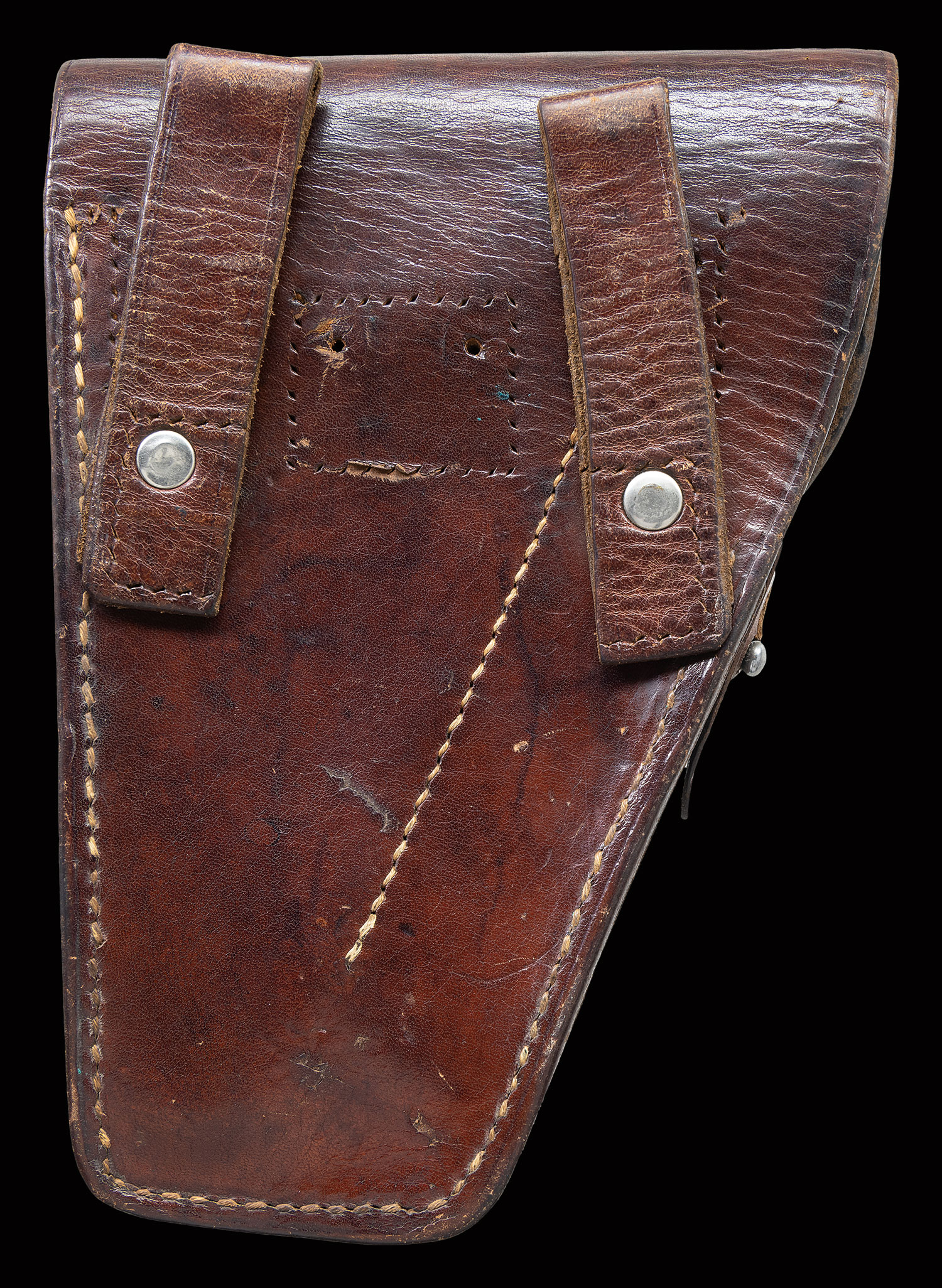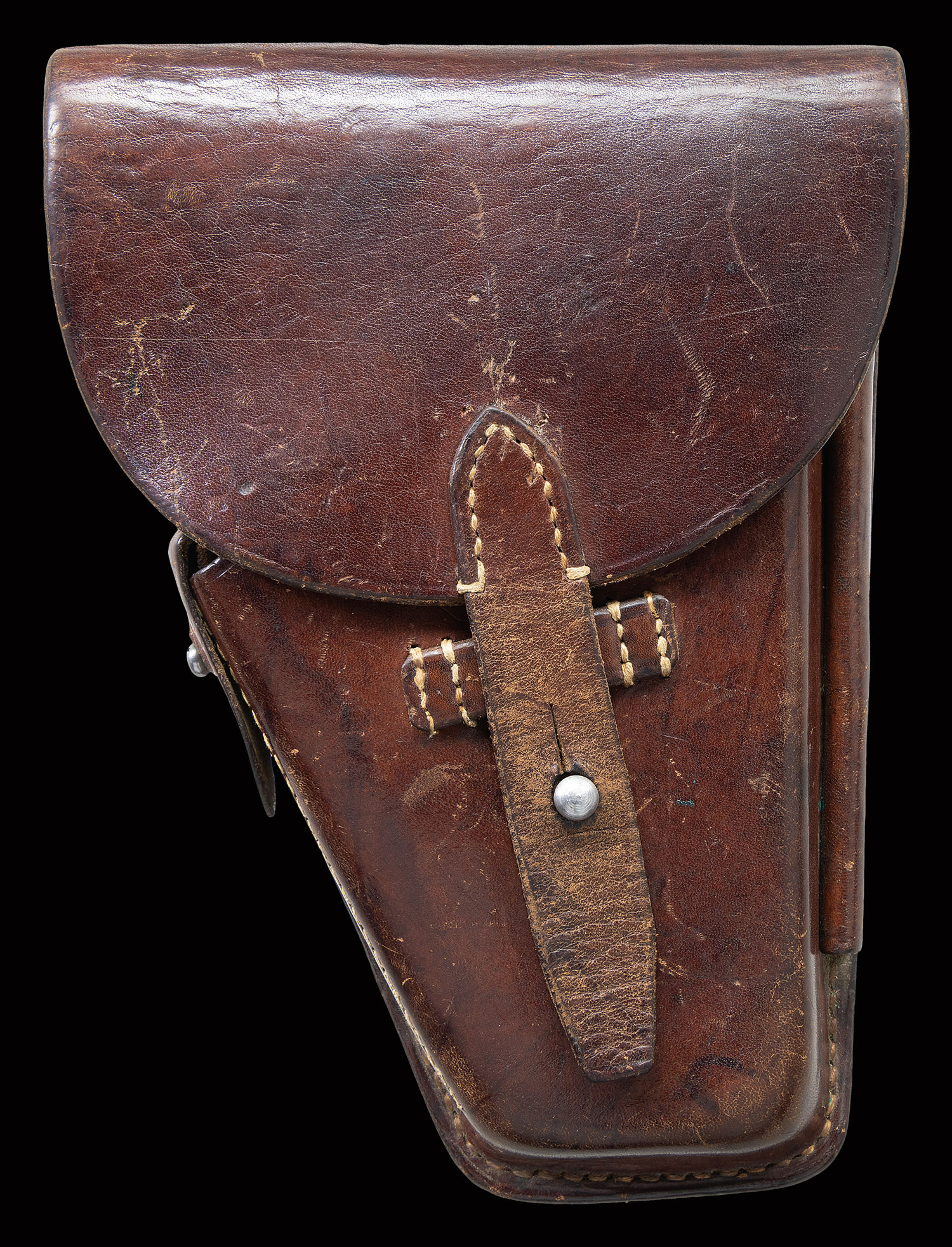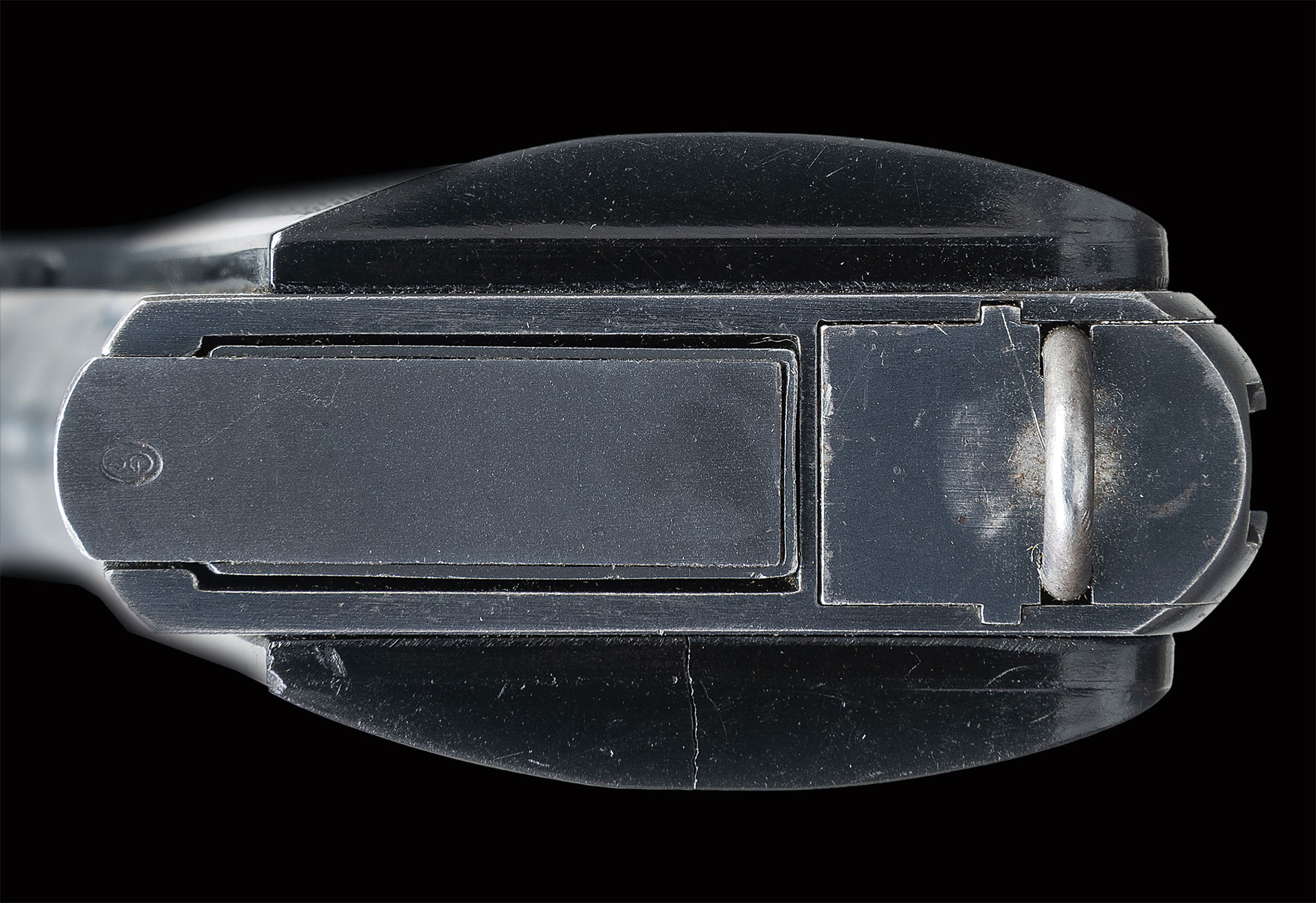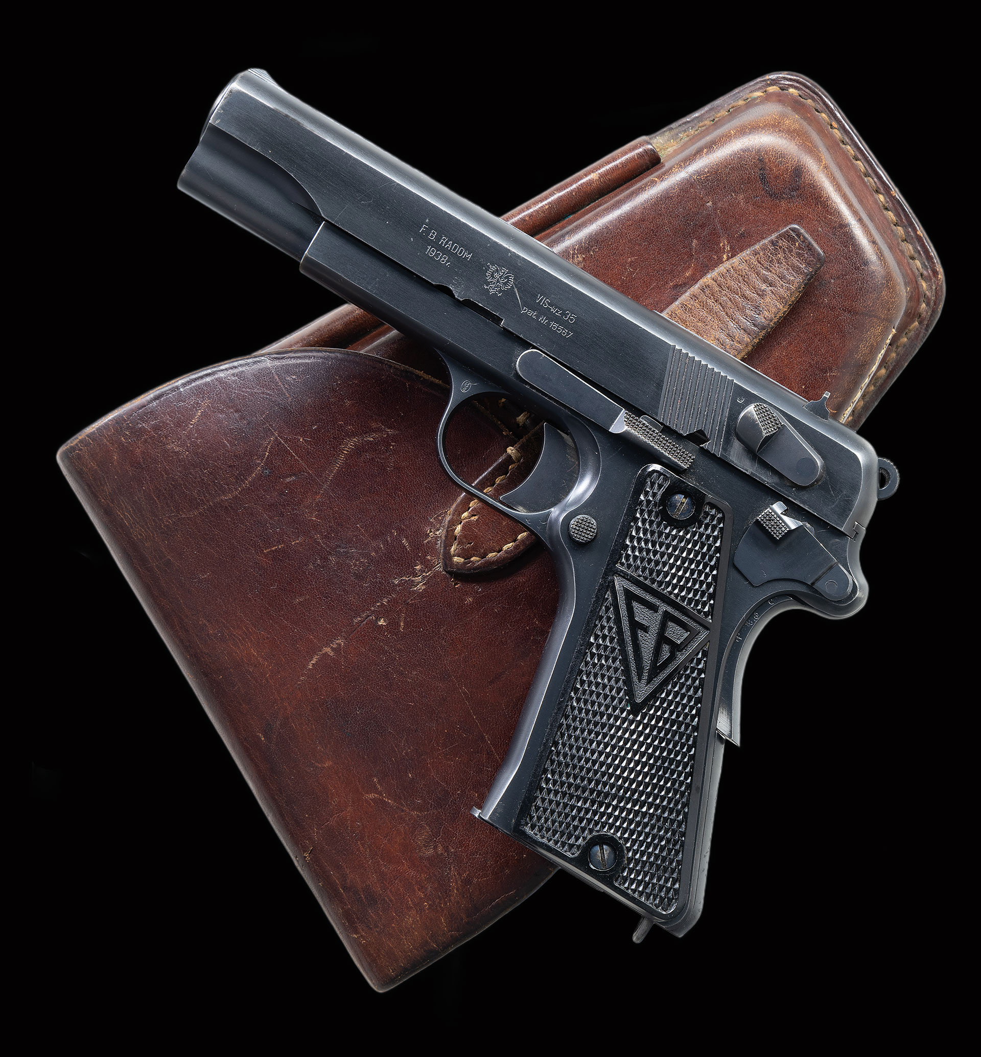 Bbl. 4 1/2″. The Radom factory made approx. 50,000 Polish eagle Radoms before WWII German occupation. This high condition example made in 1938 has the usual slide address on the left side referencing mfg., model, year of production, and patent #. Left upper trigger guard with the encircled “B/ 8” acceptance. Full S# on right side of the frame with disassembly showing a matching bbl., slide, and extractor. Fitted with crisp original “FB/ VIS” checkered border grips, each panel secured with a pair of fire blued screws. Original rust blued mag. an encircled “G/ 2” on the toe. MAGS: 1 8-rd. UANTTACHED ACCESSORIES: original holster whose “D” shoulder strap rings and narrow belt loop were replaced by a pair of broader and larger belt loops riveted in place.