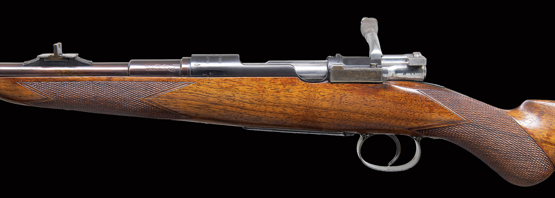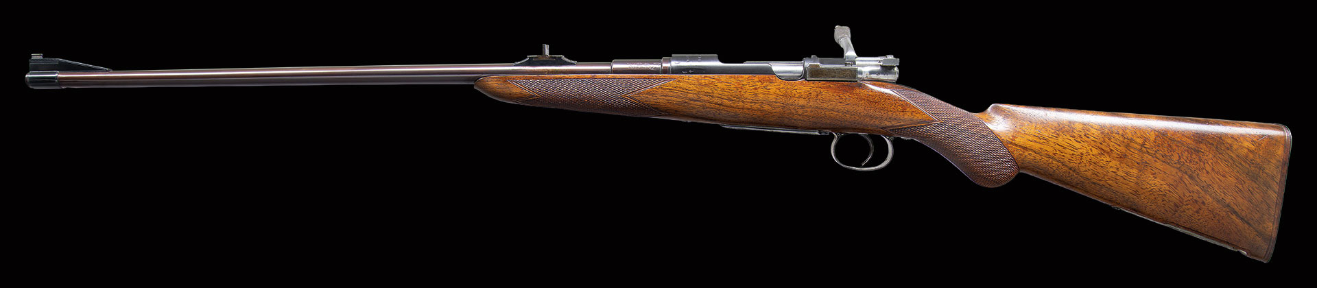 This rare commercially proofed 1896 Mauser rifle was first retailed by Army & Navy CSL of London. It has 24″ round barrel fitted with island rear base holding unusual three leaf express rear sight; silver bead with flip up night sight is in sleeved on front ramp. Top of barrel is engraved “Shot and Regulated by Army & Navy C.S.L. London. Model 1896 Mauser action is marked with Mauser name and address on receiver ring and dated “1896”. Bolt has handle turned down. Bottom metal remains in military configuration. Round knob pistol grip stock is neatly checkered. This basic rifle has been dramatically enhanced with superb engraving and some careful stock detailing.