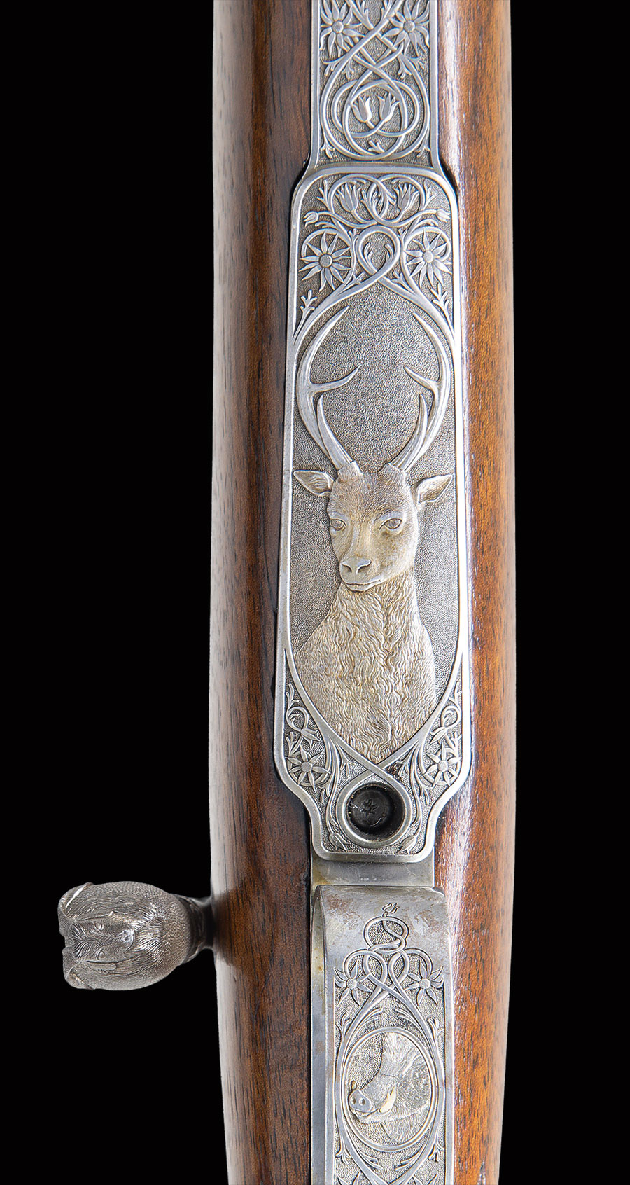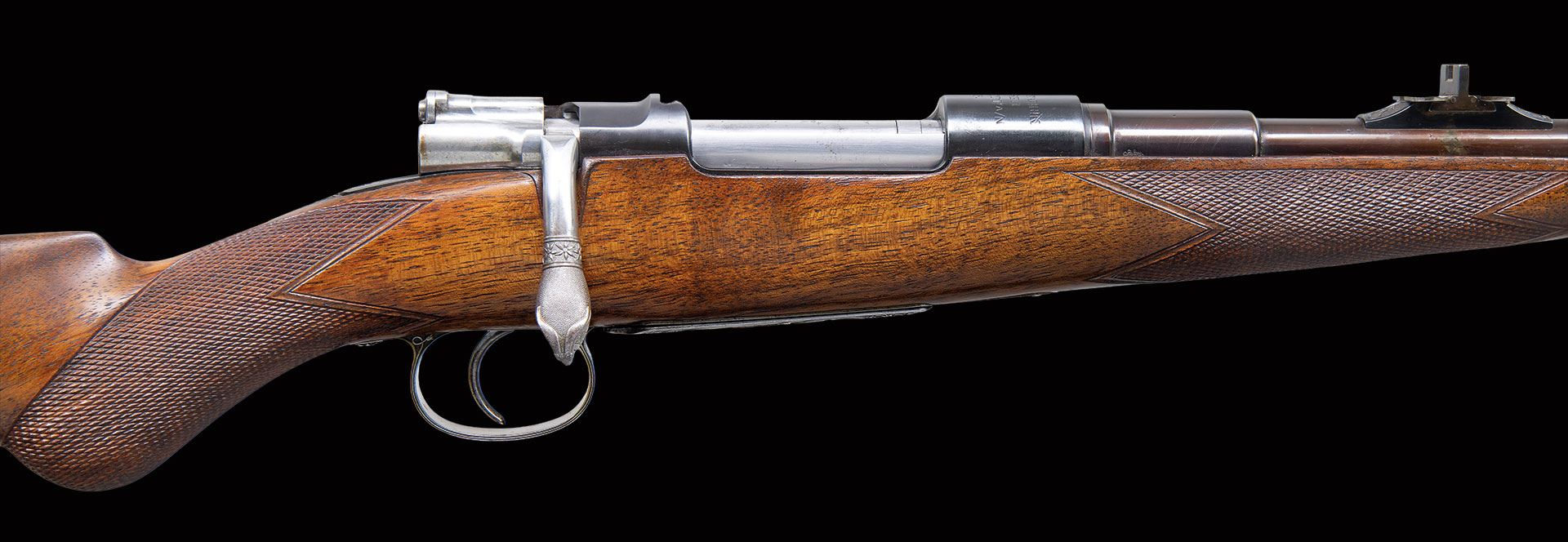 This rifle’s description was featured in 1993 “Guns Australia” magazine. The description of the embellishment is as follows: “This gun has a unique history. Previous owner Colin King of Australia commissioned master engraver Bruce Dean to rework the gun with the artfully done reminders of Australia. The trigger guard and floor plate are relief engraved with two of Australia’s favorite game animals, a wild boar and Sambar stag. These are surrounded by Australian flannel flower in intertwined deep relief scroll with a stippled background. A Neidner style steel buttplate was deep relief chiseled and pierced wtih the same flannel flower motif. A toe-line cartridge trap was added and engraved “7×57” and “Mauser”. Finally, to top it all off, the bolt handle was chiseled into a feral goat head with stippled surface and a ring of flannel flowers. The English walnut stock is excellent as professionally re-finished and features a swept pistol grip and shell-lip forearm. Generous, wrap around checkering with mullered borders covers the grip and forearm.”