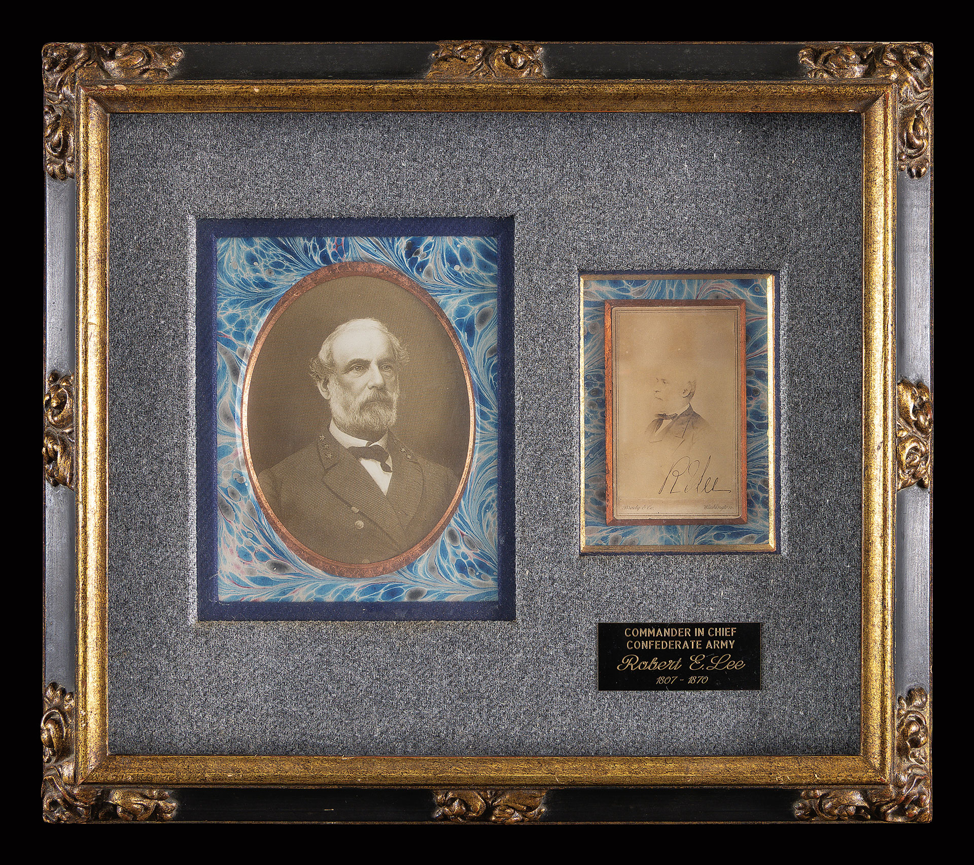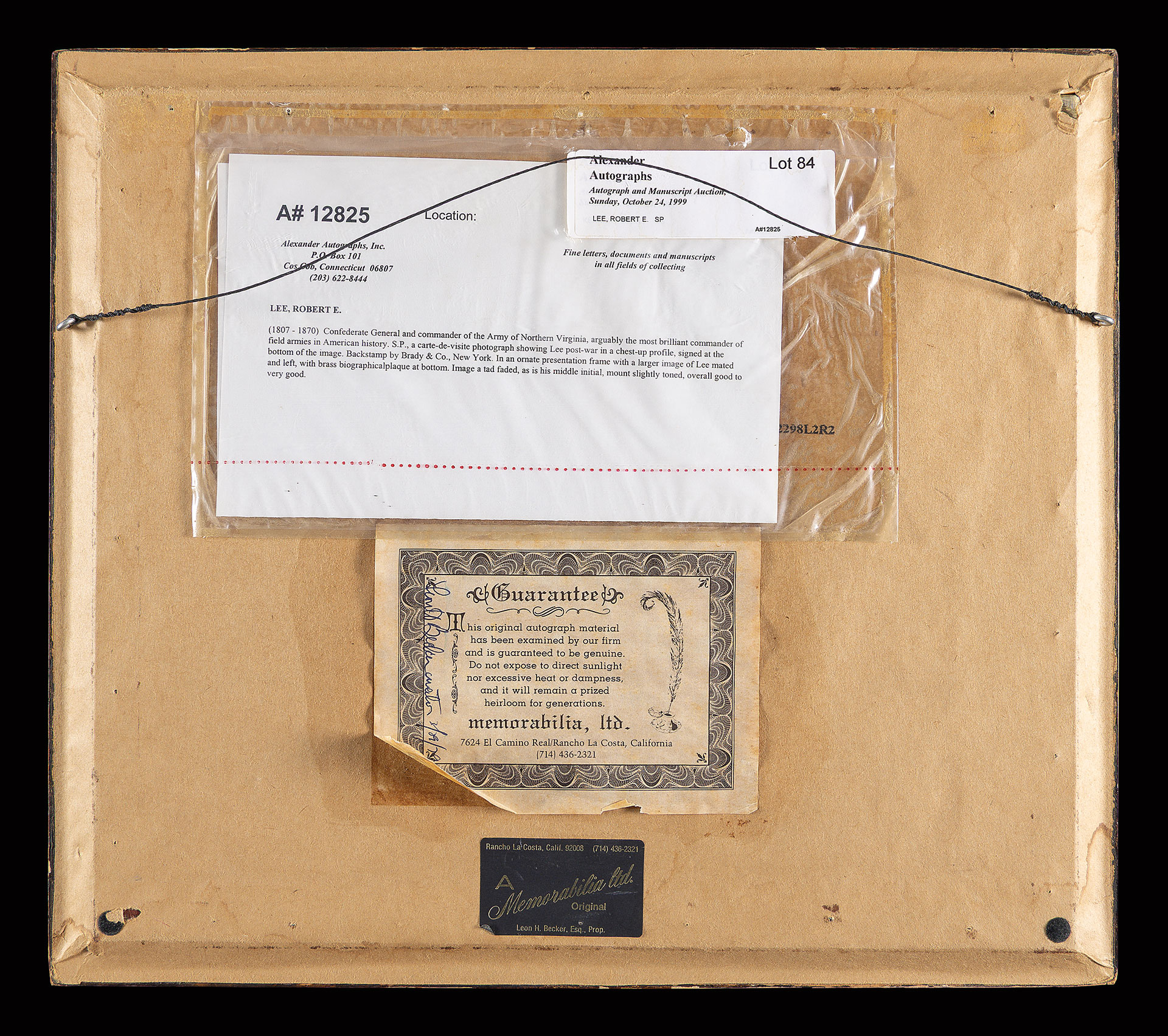 Brady & Co. chest up view of postwar Lee, nicely signed “RE Lee”, not removed from 17” x 15” frame with larger image of Lee, receipt from Alexander autographs on back of frame, lot 84, Oct. 24, 1999.