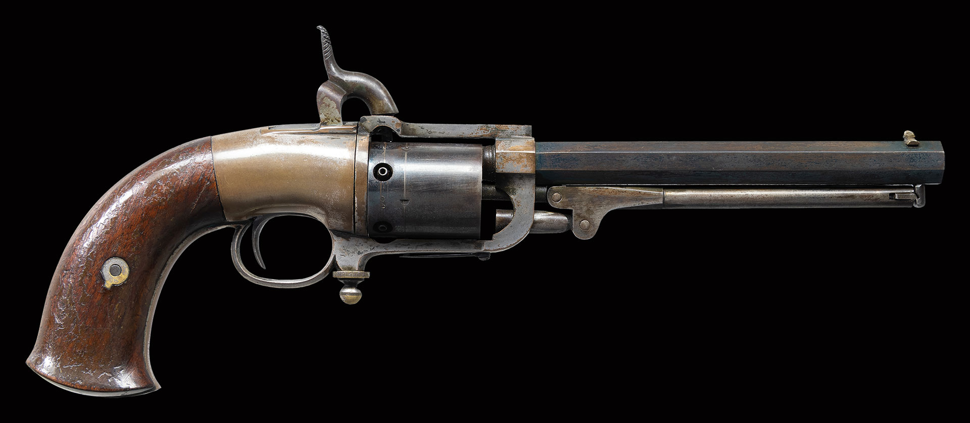 This is among the finest Butterfield Army Revolvers extant. Standard configuration of the early war large frame revolver, 5-shot cylinder, silver plated brass frame, top strap marked “BUTTERFIELD’S / PATENT DEC 11 1855 / PHILADA.”. There were only about 600 of this secondary US martial pistol made and they are rarely seen in such high condition.