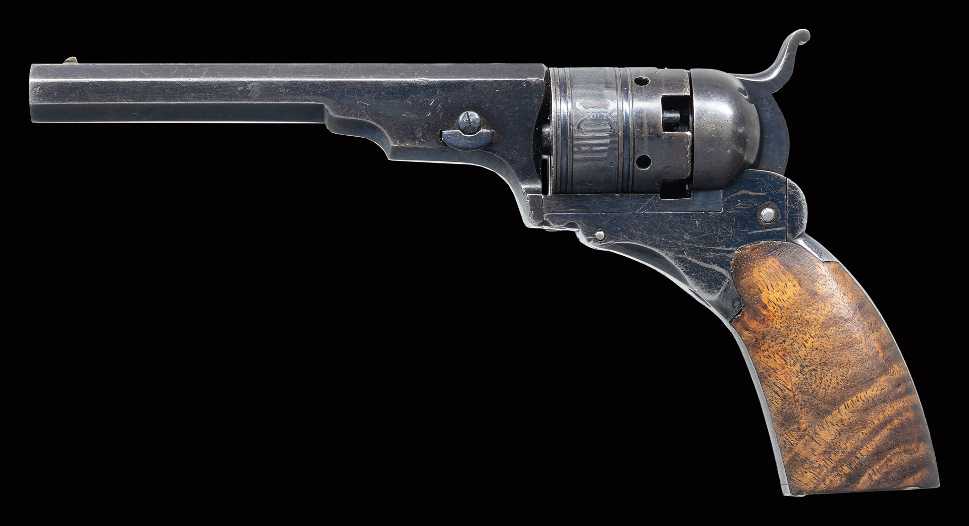 UNATTACHED ACCESSORIES: copy of December 1958 Gun report photo of revolver held by Irman Polishuk, copy of back cover of June 1971 Gun Report where revolver is offered. 2004 letter offering revolver. PROVENANCE: Iman Polishuk collection; Bob Elz offered for sale in June 1971 Gun Report; John Gangle sold to Norman Greenberg, 2004; The Esteemed Norm Greenbeg Collection.